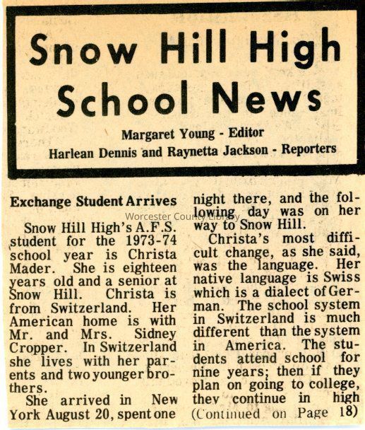 Newspaper clipping, “Exchange Student Arrives” (Christa Mader), Oct. 4, 1973Entry/Object ID