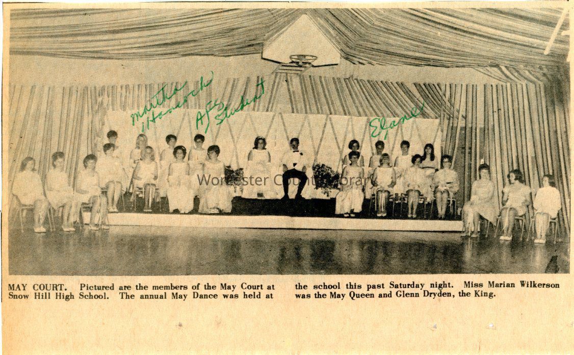 MAY COURT. Pictured are the members of the May Court at Snow Hill High School. The annual May Dance was held at the school this past Saturday night. Miss Marian Wilkerson was the May Queen and Glenn Dryden, the King.Relationships