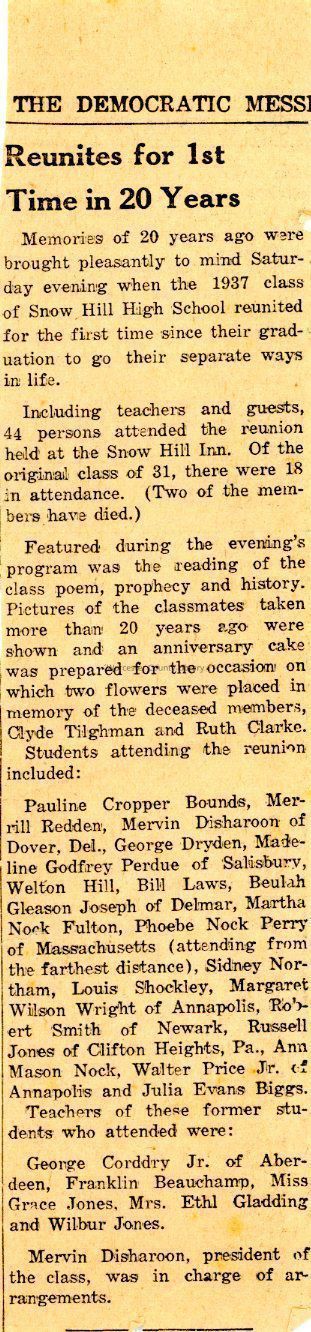 Snow Hill High School, David Clyde Tilghman, Ruth Esther Clarke, Pauline Ellen Cropper Bounds, Merrill Francis Redden, Mervin Sturgis Disharoon, George Hines Dryden, Cora Madeline Godfrey Perdue, John Welton Hill, Billie Reece Laws, Beulah Estelle Gleason Joseph, Martha Ellen Nock Fulton, Phoebe Ann Nock Perry, Sidney Otis Northam, Jr., Louis William Shockley, Sr., Margaret Winifred Wilson Wright, Robert Lee Smith, Russell Cottman Jones, Jr., Ann Mason Nock, Walter Winfield Price, Jr., Julia Evans Biggs, George Henderson Corddry, Jr., Franklin Beauchamp, Grace Jones, Ethel Shockley Bromley Gladding, Wilbur Arthur Jones