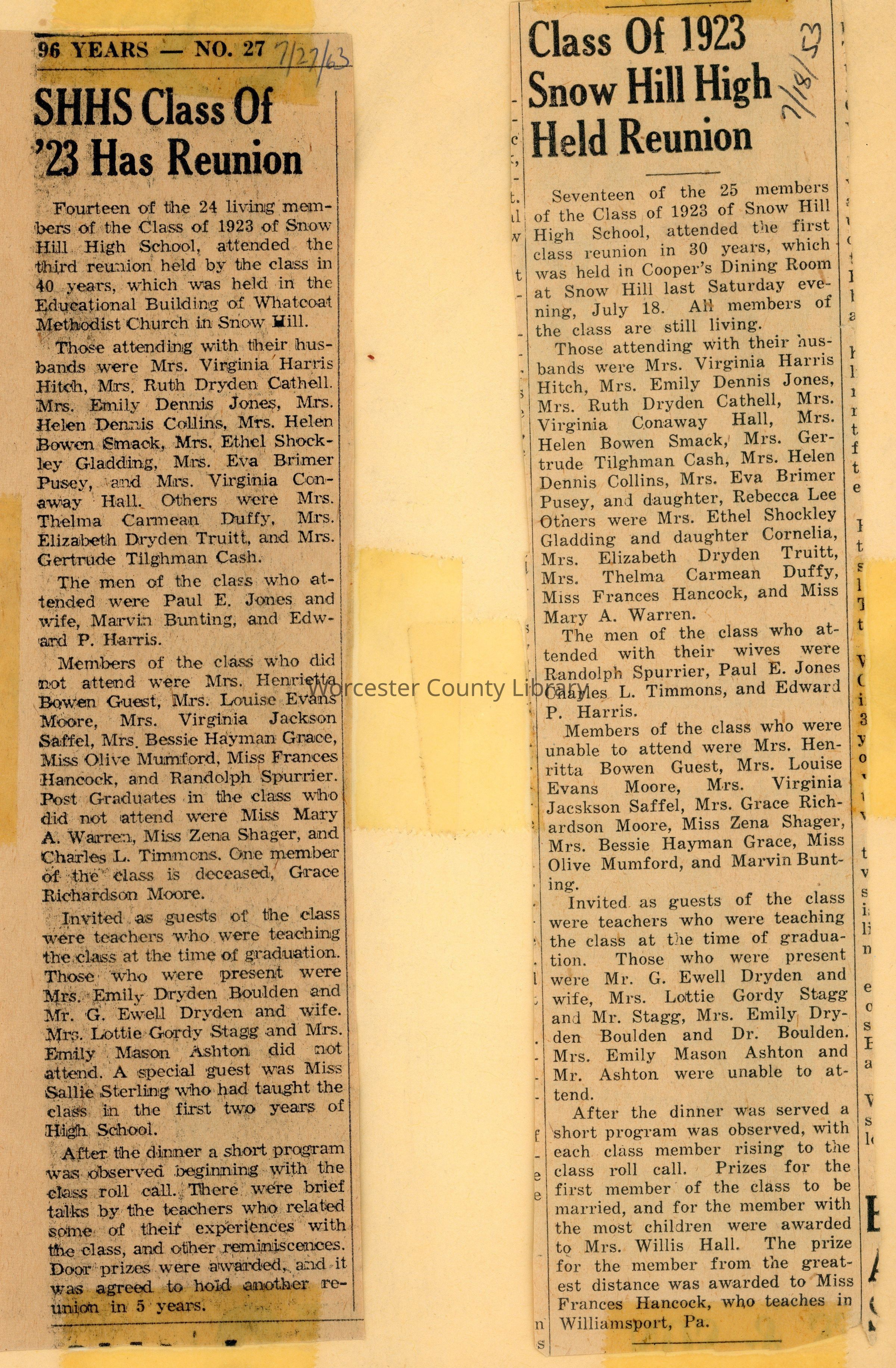 Snow Hill High School, Whatcoat Methodist Episcopal Church, Virginia Mae Harris Hitch Bounds, Ruth B. Dryden Cathell, Emily Dennis Jones, Helen Dennis Collins, Helen Bowen Smack, Ethel Shockley Bromley Gladding, Eva Brimer Pusey, Virginia Conaway Hall, Thelma Carmean Duffy, Elizabeth Dryden Truitt, Gertrude Tilghman Cash, Paul Elton Jones, Marvin Bunting, Edward P. Harris, Henrietta Donovan Bowen Guest, Louise Evans Moore, Virginia Jackson Saffel, Bessie Stagg Hayman Grace, Olive Mumford, Frances Hancock, Randolph Spurrier, Mary Avery Warren, Zena Shager, Charles L. Timmons, Grace Richardson Moore, Emily Dryden Boulden, George Ewell Dryden, Charlotte C. Gordy Stagg, Emily Mason Ashton, Sallie Sterling, Curtis Francis Hitch, Thomas Kerbin Cathell, James Roscoe Smack, Willis Hall