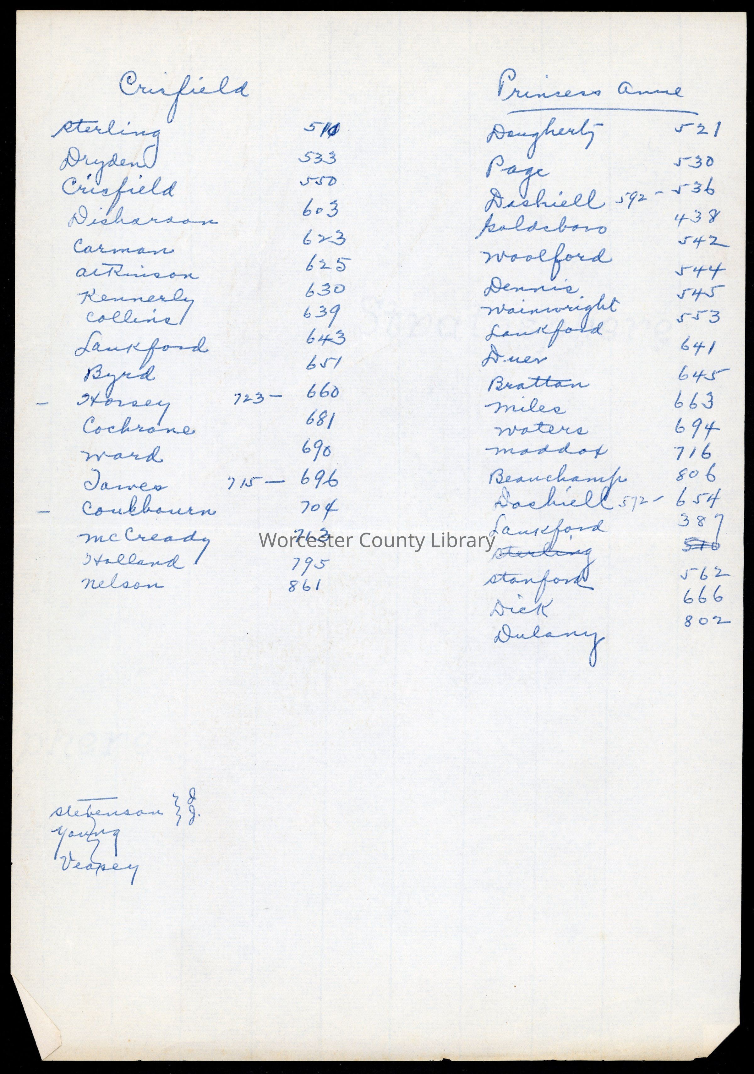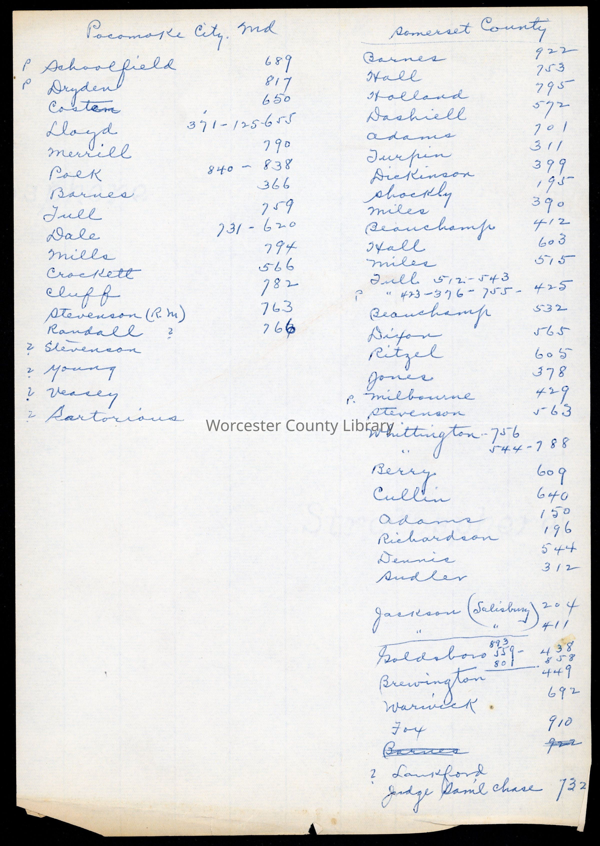 Note with names of nearby towns with last names listed underneath with numbers beside them. Meaning of names and numbers is unknown.