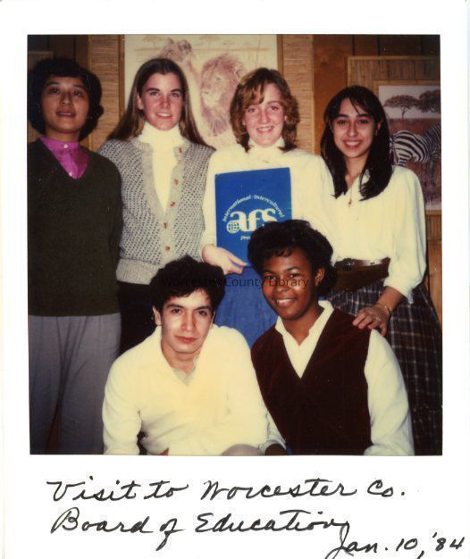 Photograph of Bixiti Cai, Stephanie Chissler, Nelson Hincatie, Leslie Murray, Rita Barchetti, and Jackie Baine at Worcester Co. Board of Education, Jan 1984Entry/Object ID