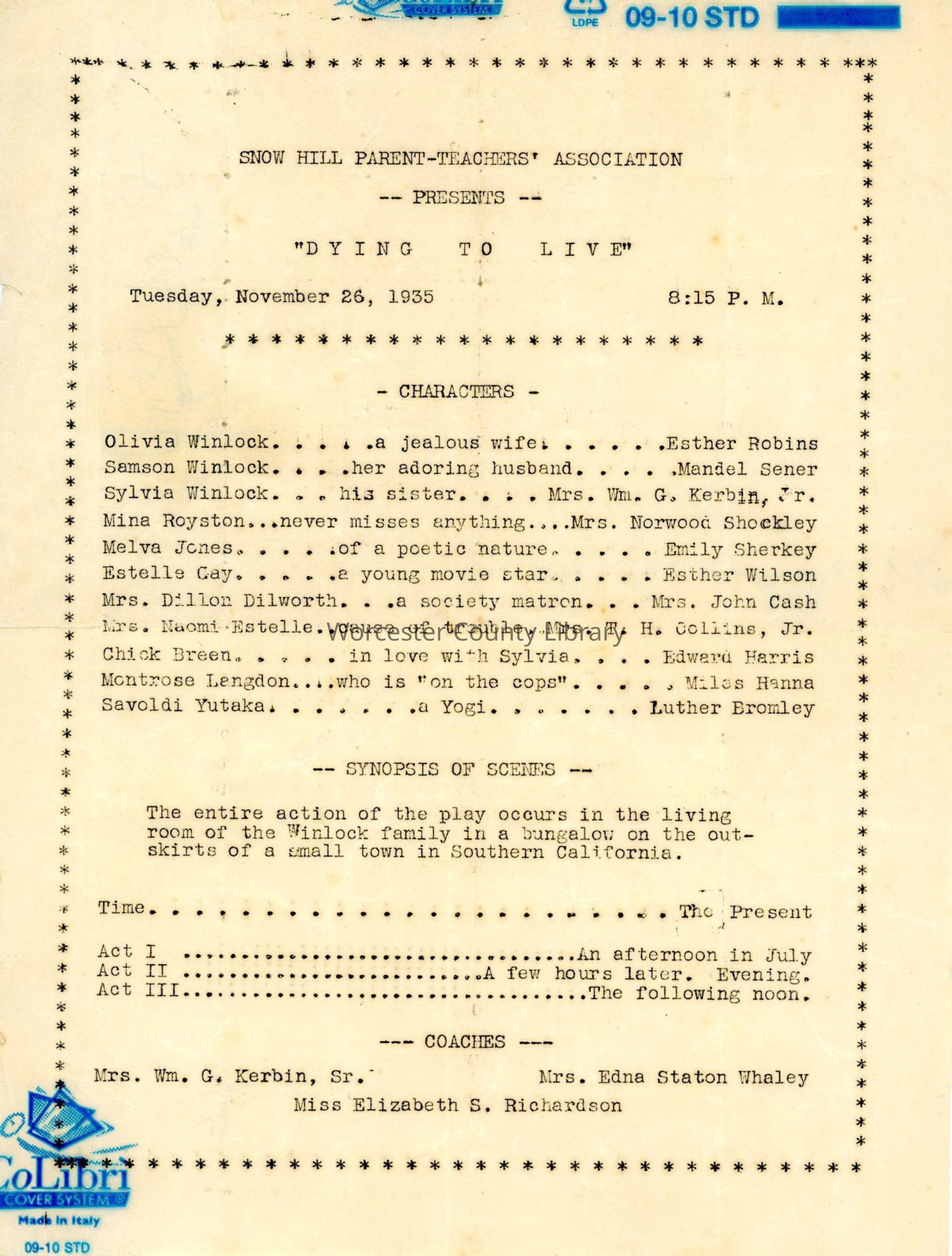 Snow Hill High School, Snow Hill Parent-Teacher Association, Esther Robins, Mandel Sener, Margaret Merrill Howard Kerbin, Mrs. Norwood Shockley, Emily Sherkey, Esther Wilson (1935), Mrs. John Cash, Mrs. T. H. Collins, Jr., Edward Harris, Miles Hanna, Luther Bromley, Alice Boehm Kerbin, Edna Staton Whaley, Elizabeth S. Richardson