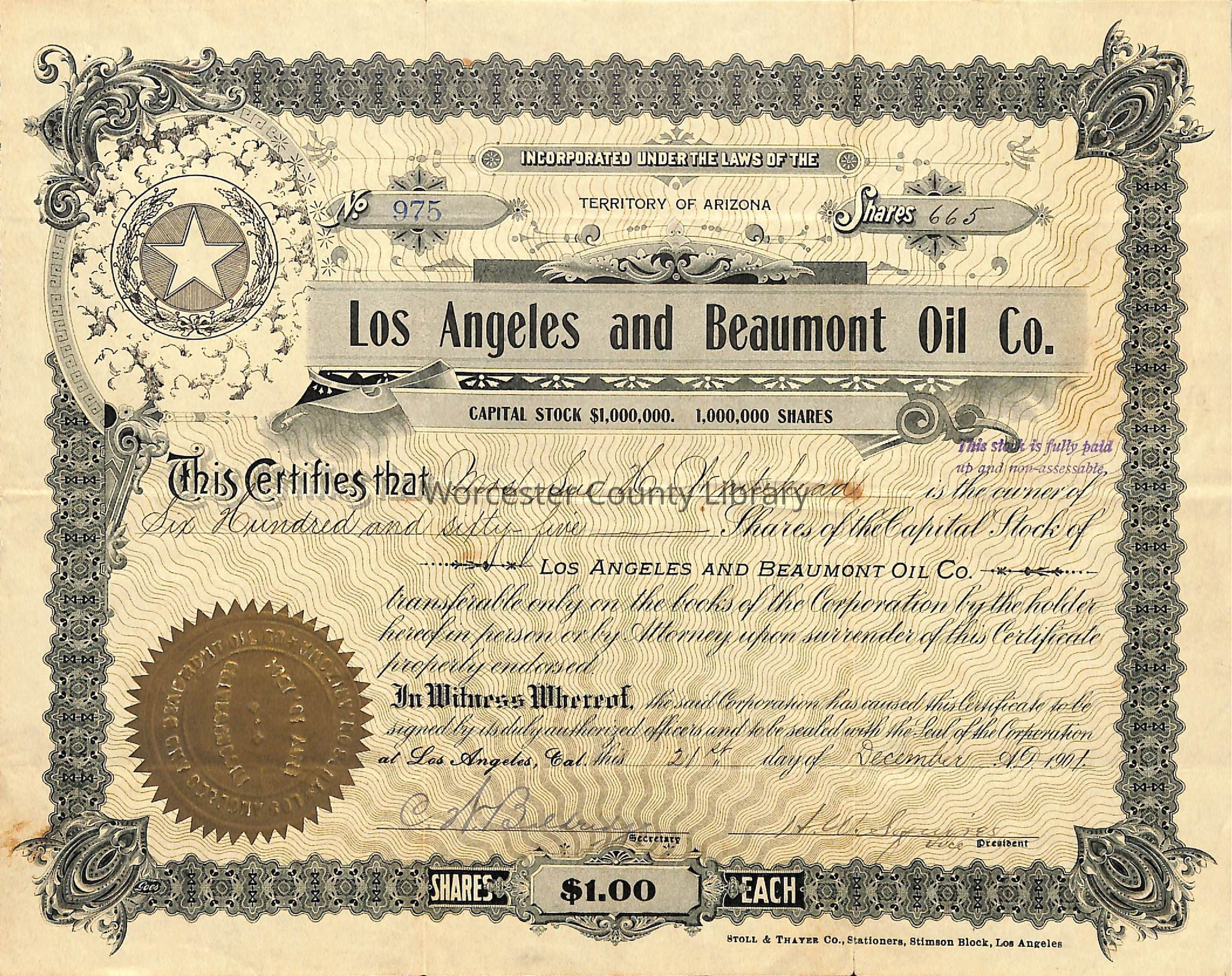 Stock Certificate, Los Angeles and Beaumont Oil Co., 1901Entry/Object ID