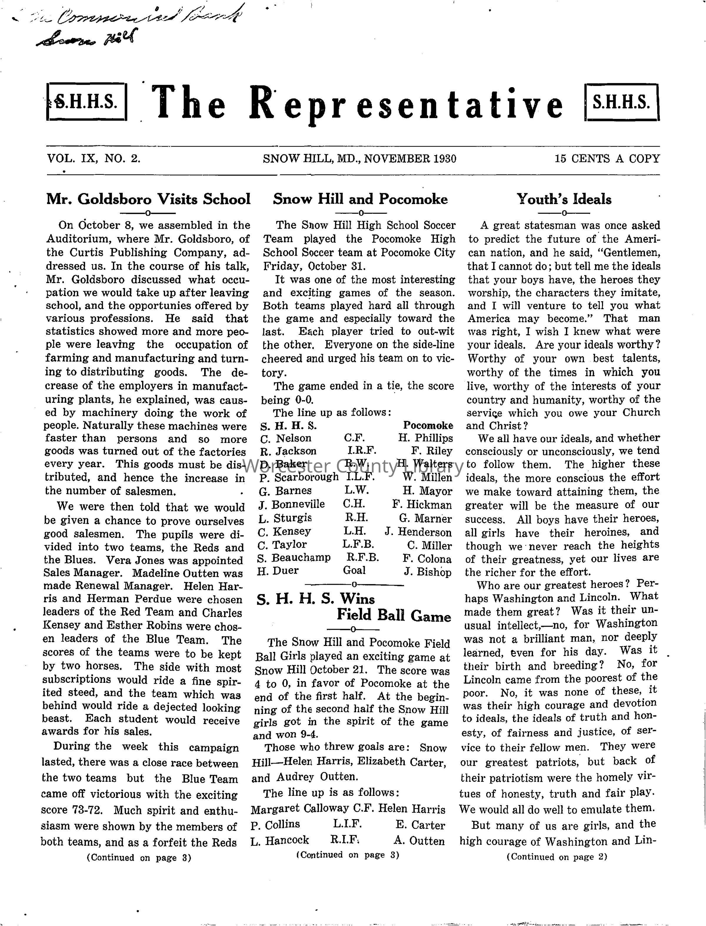 The Representative, Snow Hill High School, November 1930Entry/Object ID