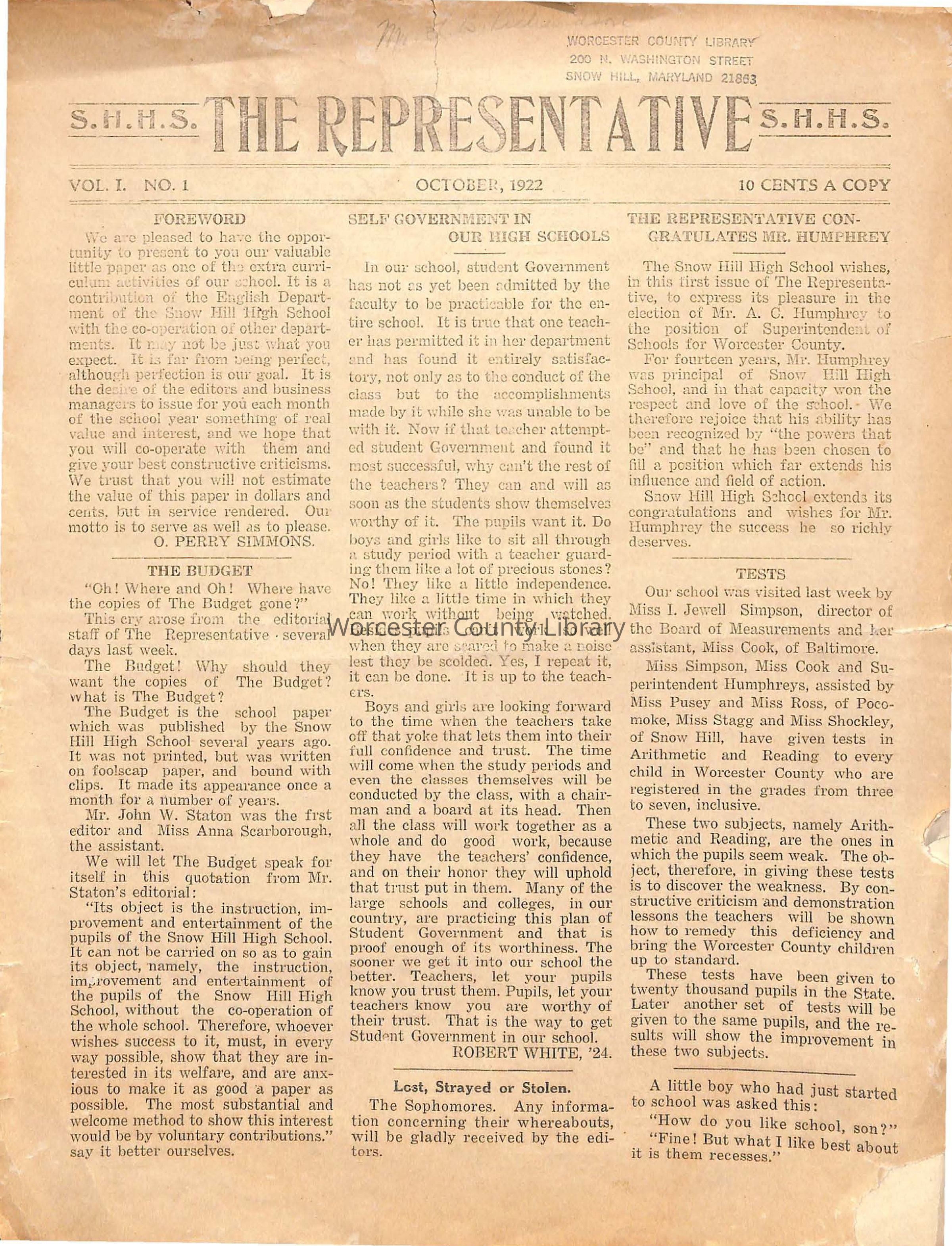 The Representative, Snow Hill High School, October 1922, incompleteEntry/Object ID