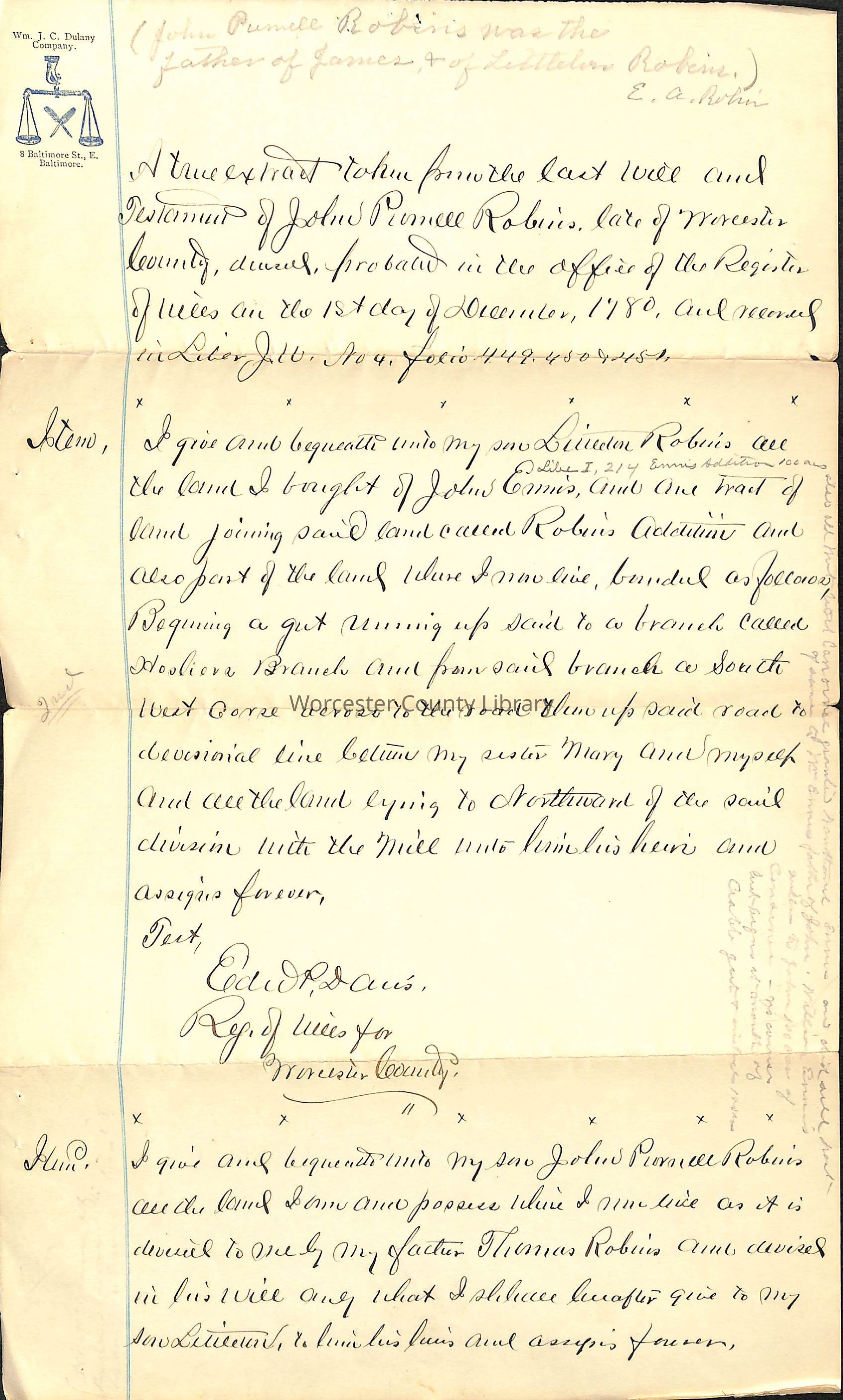 Will Excerpt, John Purnell Robins, 1780Entry/Object ID
