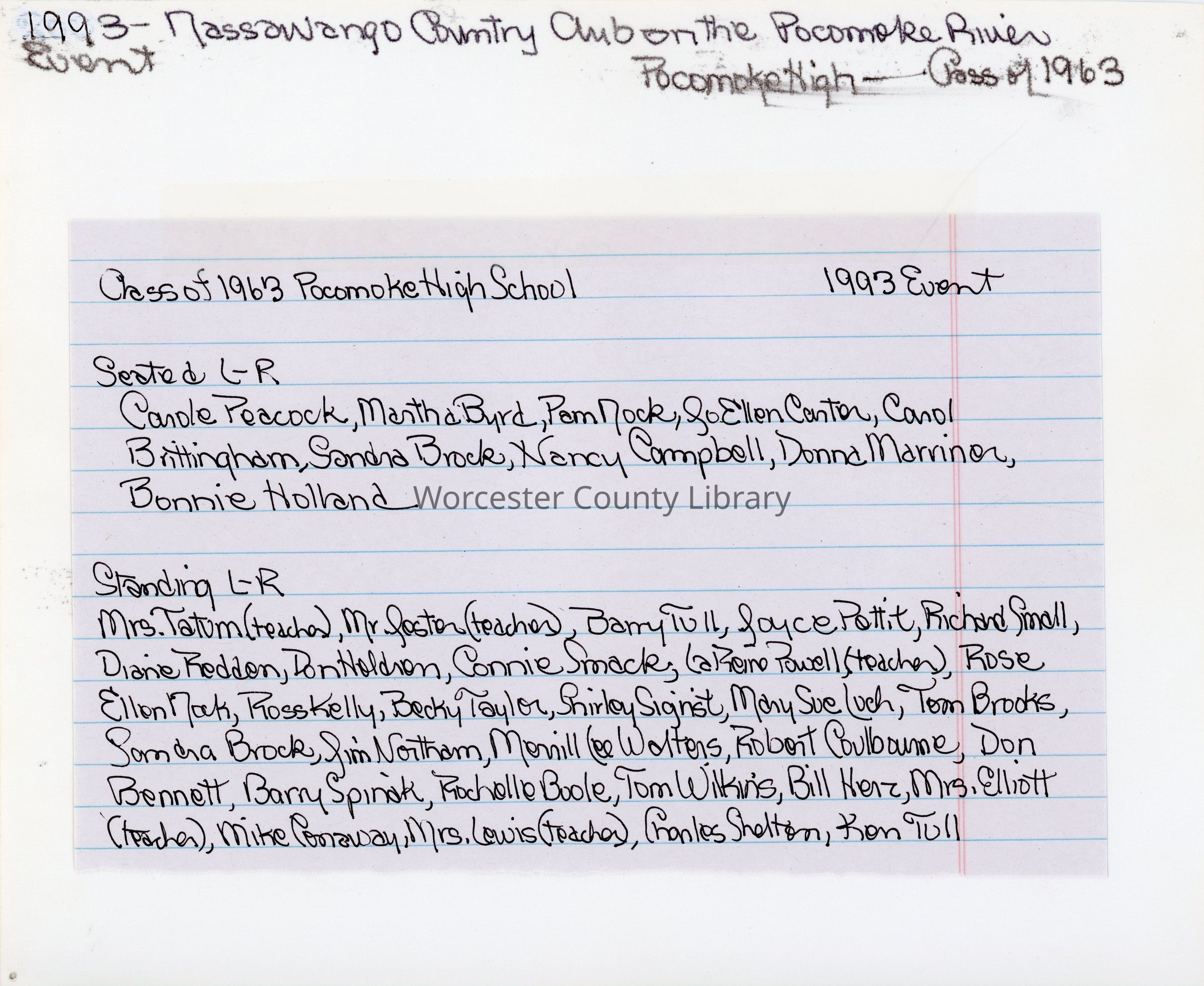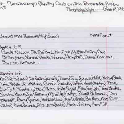 Pocomoke High School, Nassawango Country Club, Carole Frances Peacock Voss, Martha Florence Byrd Jones Roe, Pamela Lee Nock Mariner, JoEllen Cannon Carter Gladding, Carol Elizabeth Brittingham Wilkes, Sandra Lea Brock Dryden, Nancy Ann Campbell Wood, Donna Faye Marriner Quick, Bonnie Ann Holland Carroll Crawford, Luella Byrd Hall Tatem, John Nelson Jester, Barry William Tull, Joyce Elaine Petitt Whitehead, Richard Earl Small, Diane Jane Redden Tull, Don Robert Holdren, Constance Smack Beckwith, LaReine Harriet Thornton Powell, Rose Ellen Nock Owens, Ross Leonard Kelly, Rebecca Ann Taylor Heiser, Shirley Jean Sigrist Rantz Lewis, Mary Sue Luch Hurst, Tom Brooks, Jim Northam, Merrill Lee Walters Truman, Robert Edward Coulbourne, Donald Lane Bennett, Richard Barry Spinak, Rochelle Anne Boole Matthews, Thomas William Wilkins, William Howard Herz, Nevelyn Estelle Evans Pfeltz Daugherty Elliott Edwards, Michael Gary Conaway, Effie Lewis, Charles Conaway Shelton, Kenneth Lynn TullSubject Place