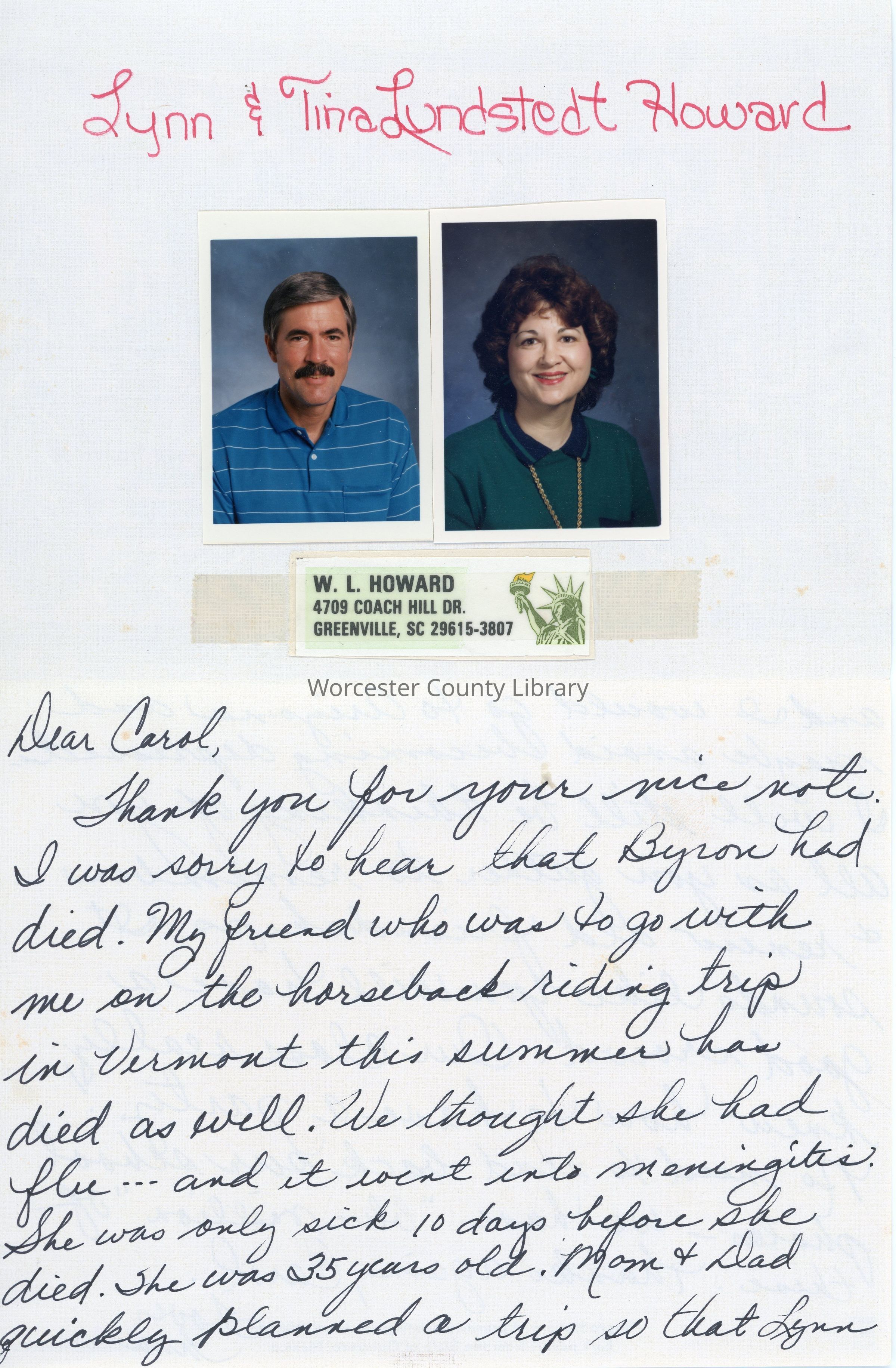 Letter, from Lynn and Tina Lindstedt Howard to Carol Wilkes BrittinghamEntry/Object ID