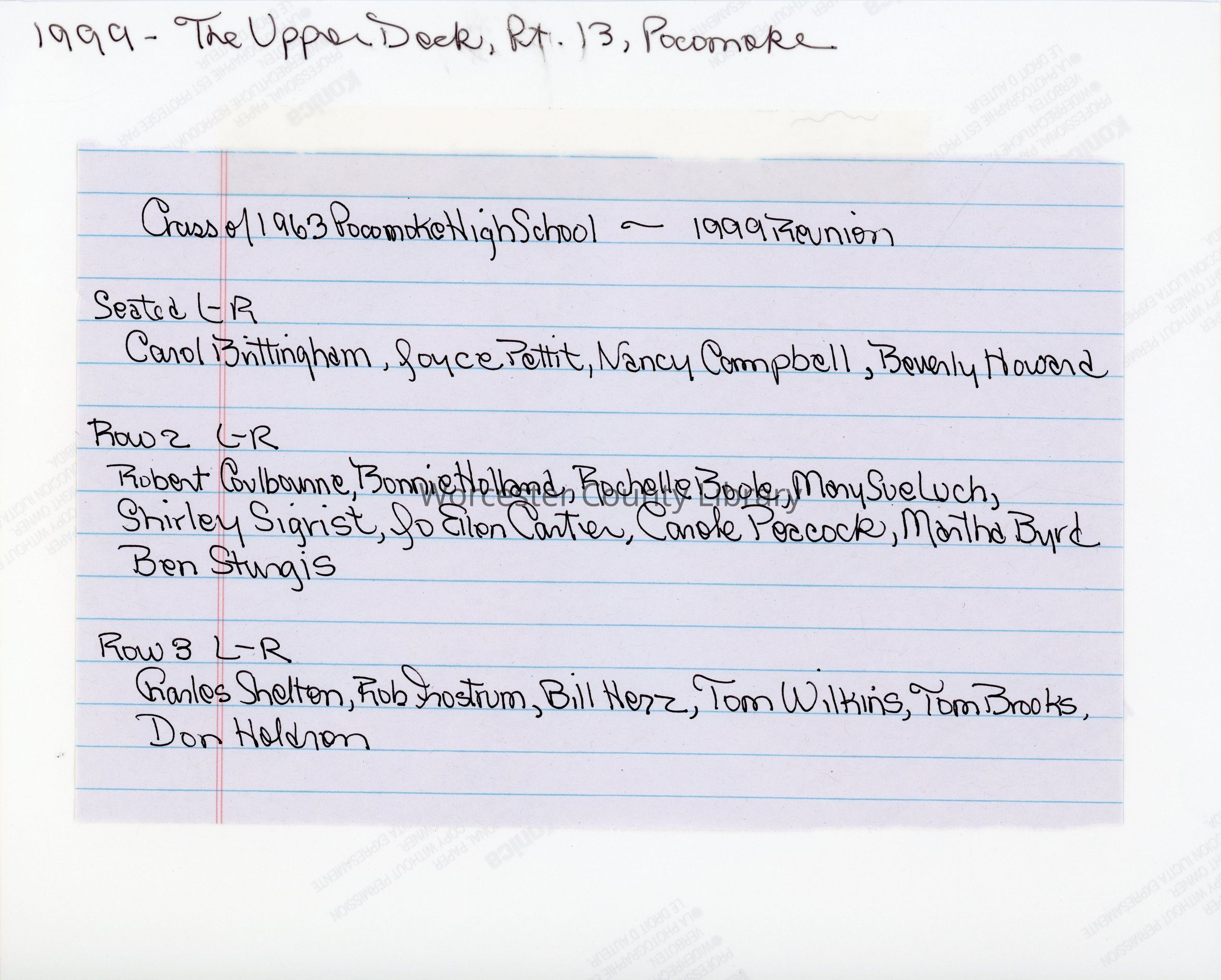 Pocomoke High School, The Upper Deck, Carol Elizabeth Brittingham Wilkes, Joyce Elaine Petitt Whitehead, Nancy Ann Campbell Wood, Beverly Howard Bowden Watson, Robert Edward Coulbourne, Bonnie Ann Holland Carroll Crawford, Rochelle Anne Boole Matthews, Mary Sue Luch Hurst, Shirley Jean Sigrist Rantz Lewis, JoEllen Cannon Carter Gladding, Carole Frances Peacock Voss, Martha Florence Byrd Jones Roe, William Benson Sturgis, Jr., Charles Conaway Shelton, Robert Julius Frostrom, Jr., William Howard Herz, Thomas William Wilkins, Tom Brooks, Don Robert Holdren
