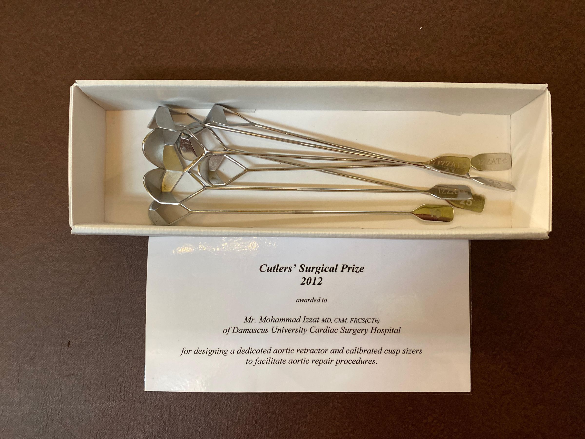 Cutlers' Surgical Prize 2012 awarded to Mr. Mohammad Izzat MD FRCS(CTh) of Damascus University Cardiac Surgery Hospital for designing a dedicated aortic retractor and calibrated cusp sizers to facilitate aortic repair procedures.