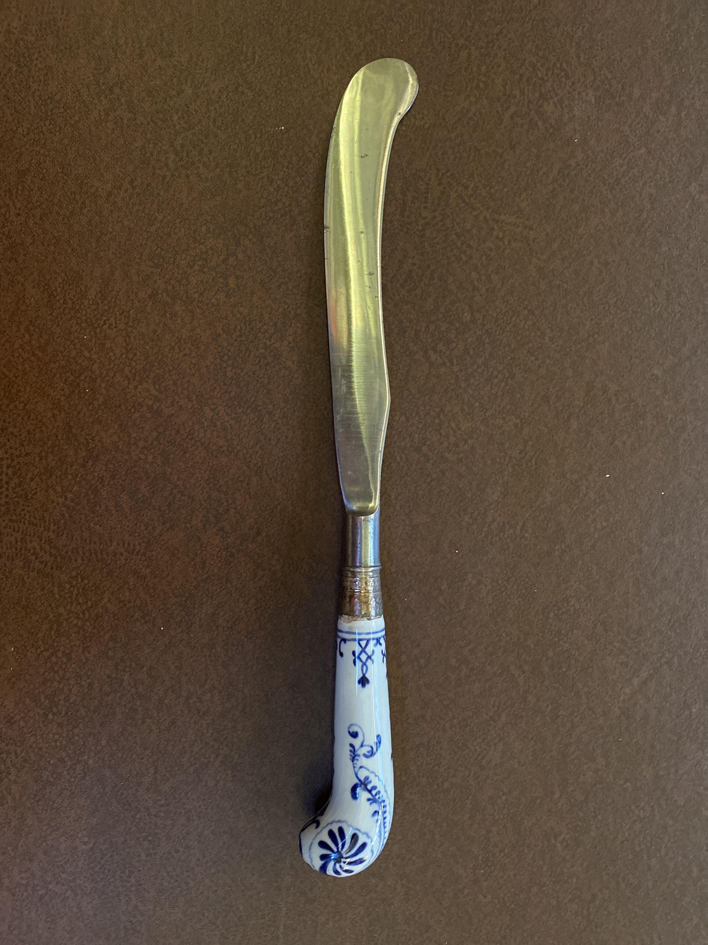 Blade sabre-shaped with a plain silver long bolster. Handle pistol-shaped of Bow blue and white porcelain with a silver ferrule.Collection