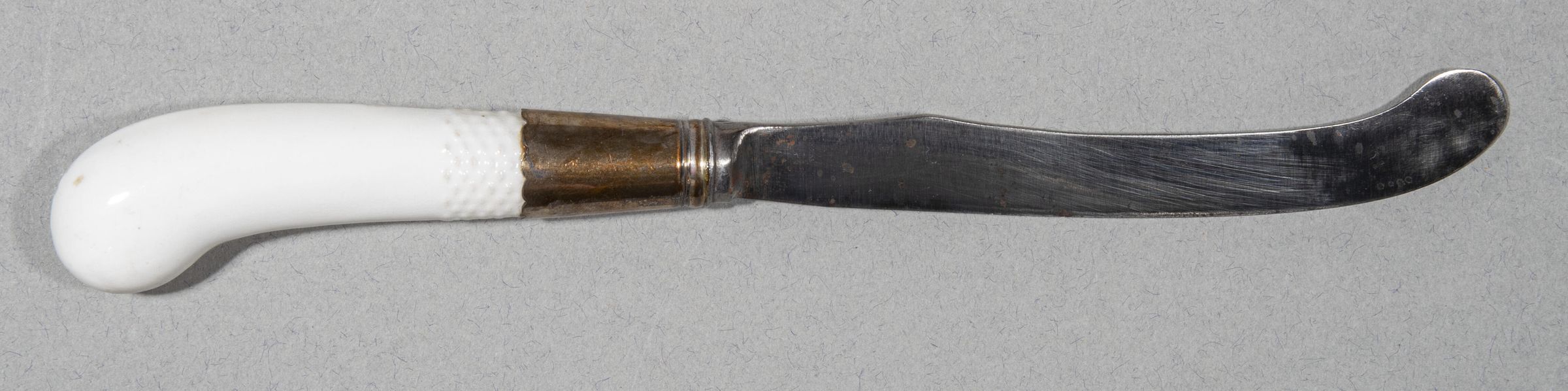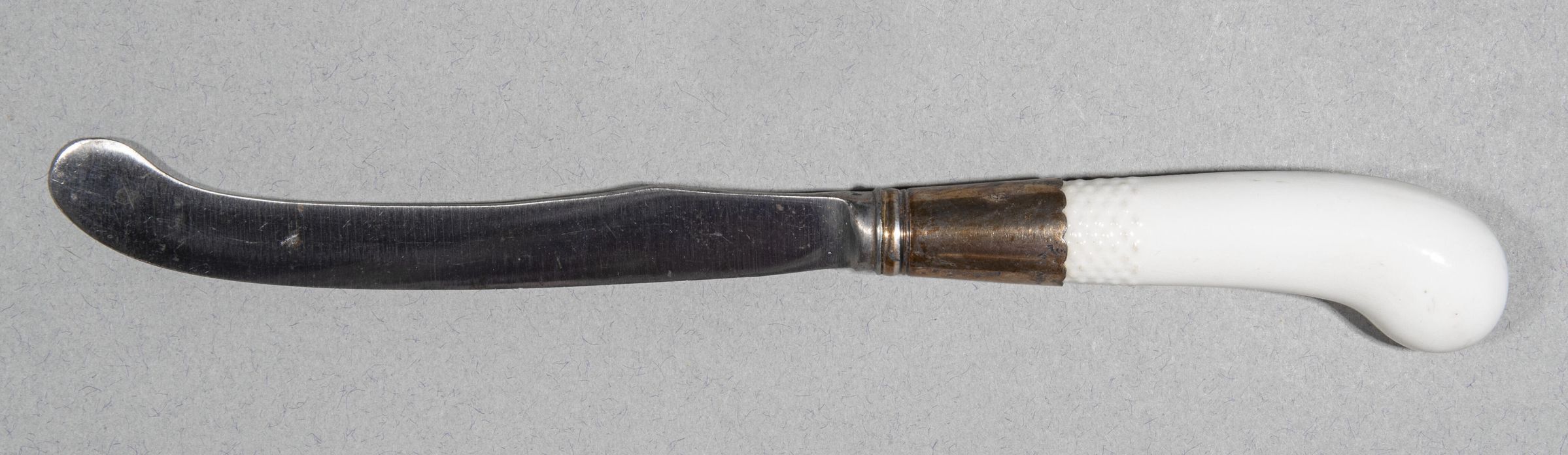 Sabre-shaped blade with plain concave bolster. Pistol-shaped handle of white Meissen procelain with basket-weave texturing at both ends and painted floral decoration, one depicting a couple in period costume in a woodland setting, the male playing a horn and the female a clarinet. Silver ferrule with two plain bands incised at top and bottom.Collection