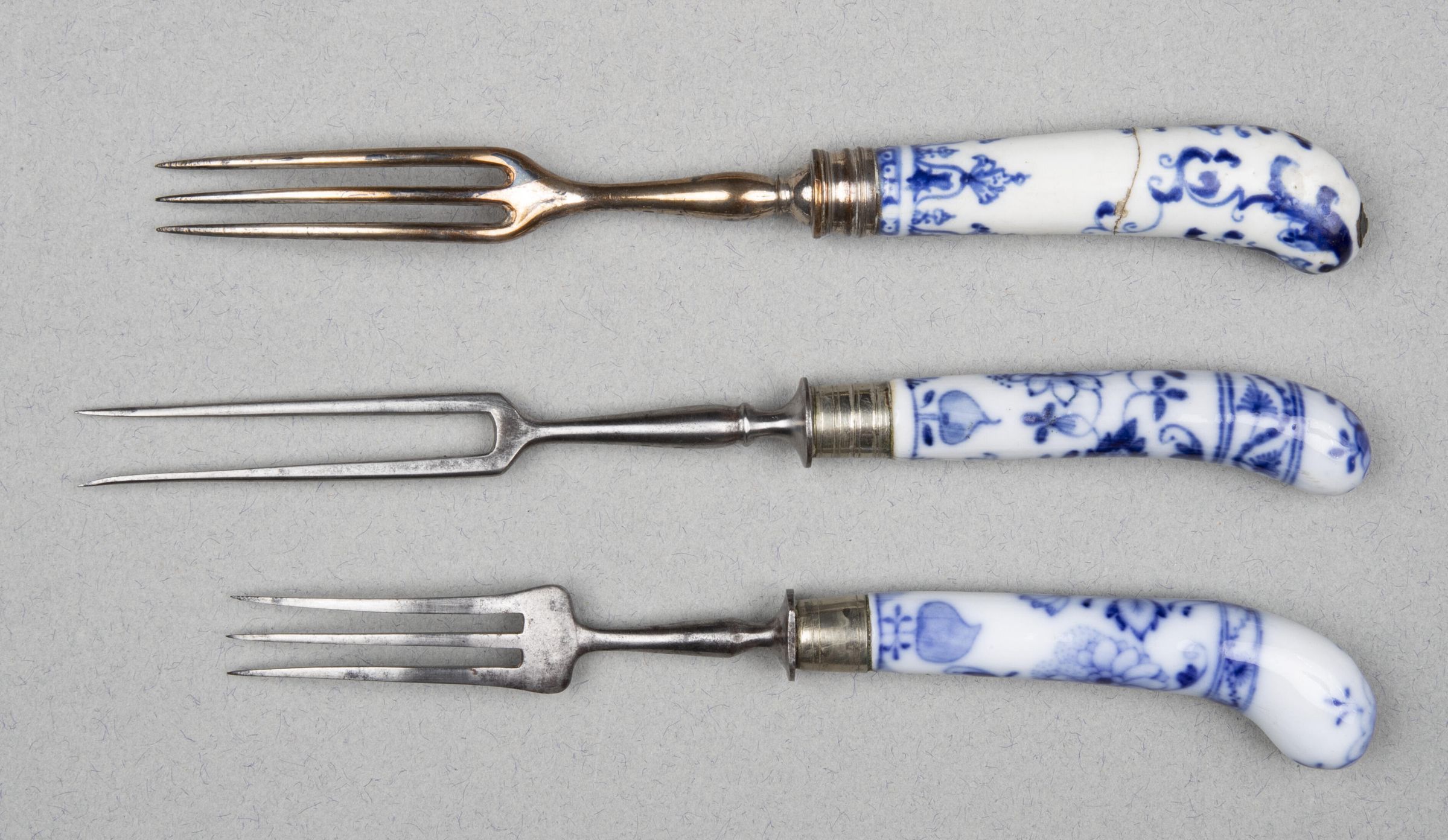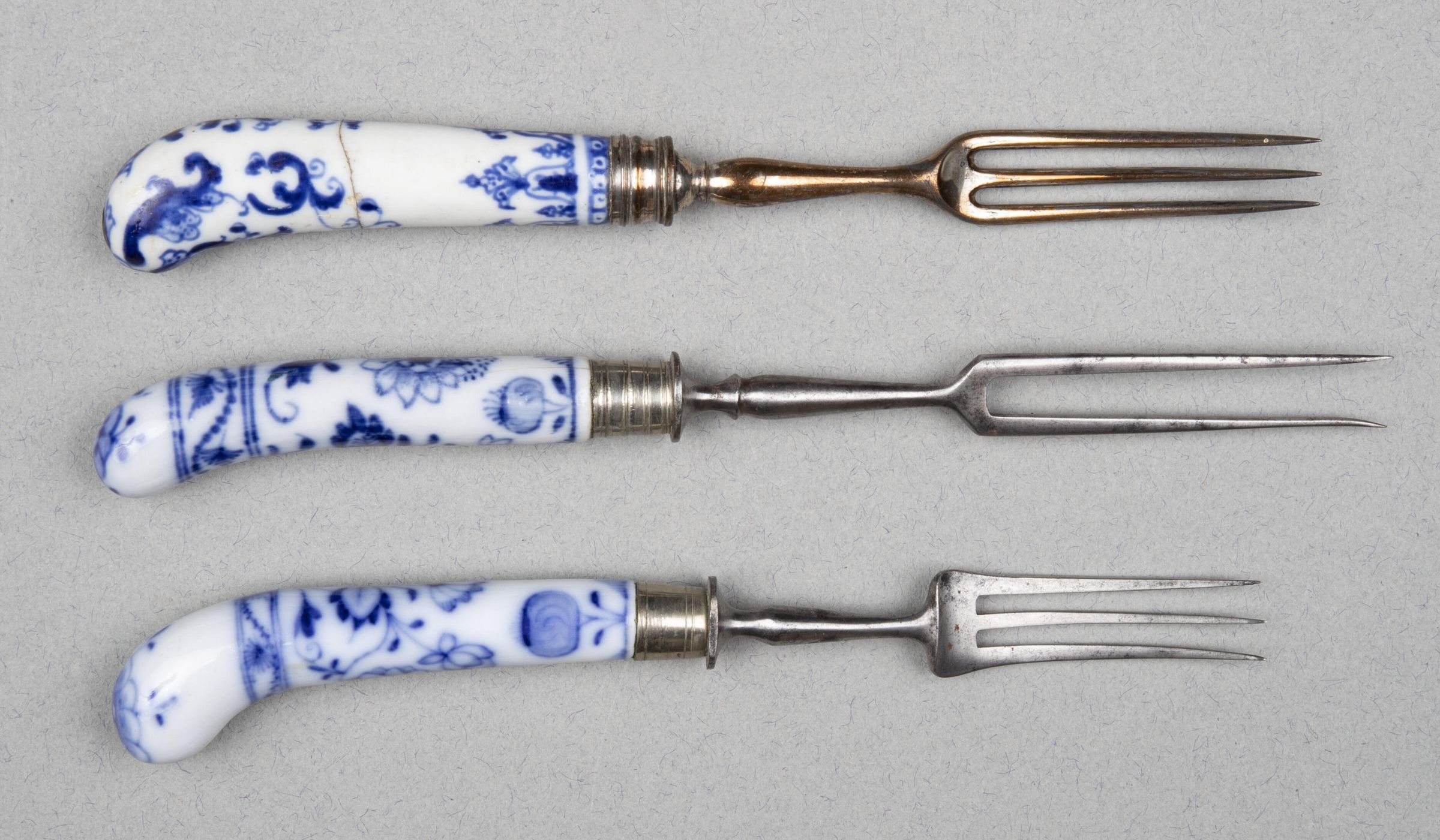 Three tines of rectangular section flaring slightly at point and widening to square shoulders, offset to a plain baluster-shaped neck. Plain silver ferrule engraved with banded lines at the bottom and one single line around top. Pistol-shaped handle of white Meissen porcelain with blue underglaze having floral designCollection