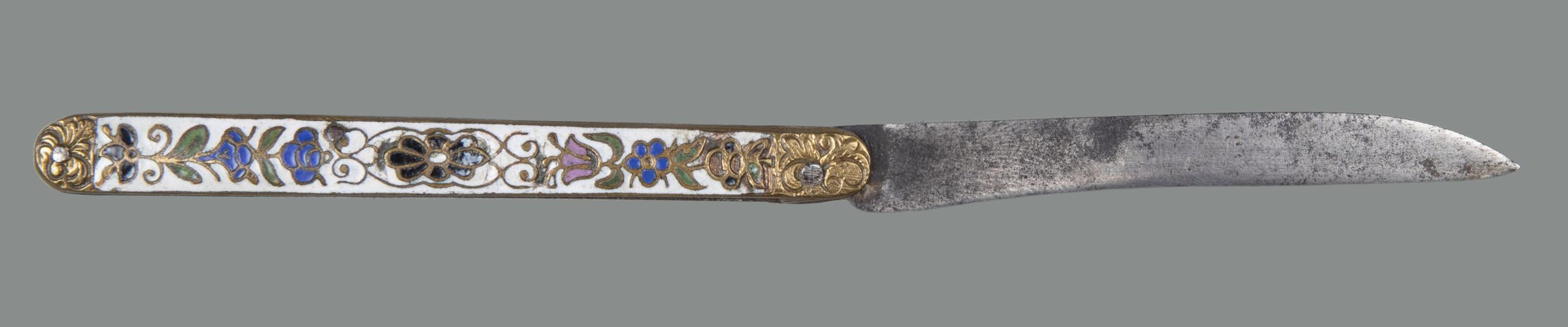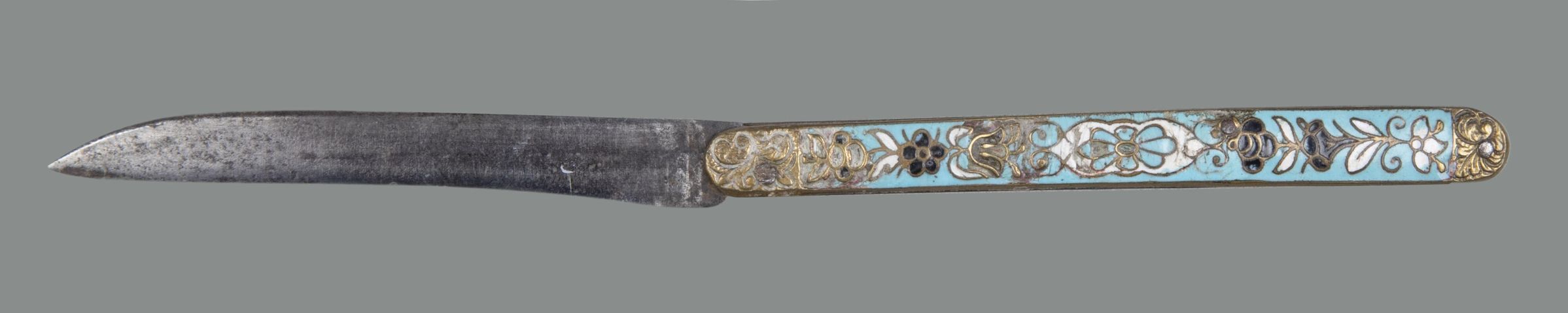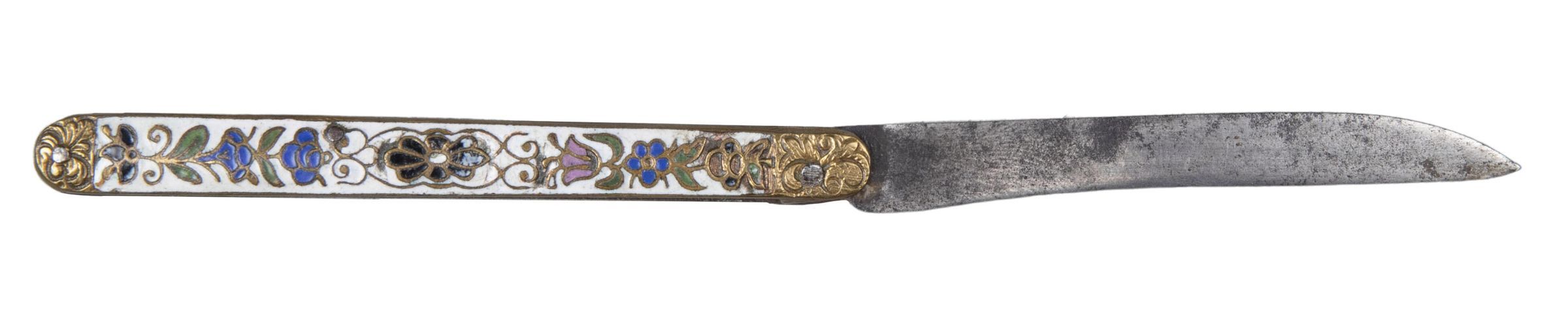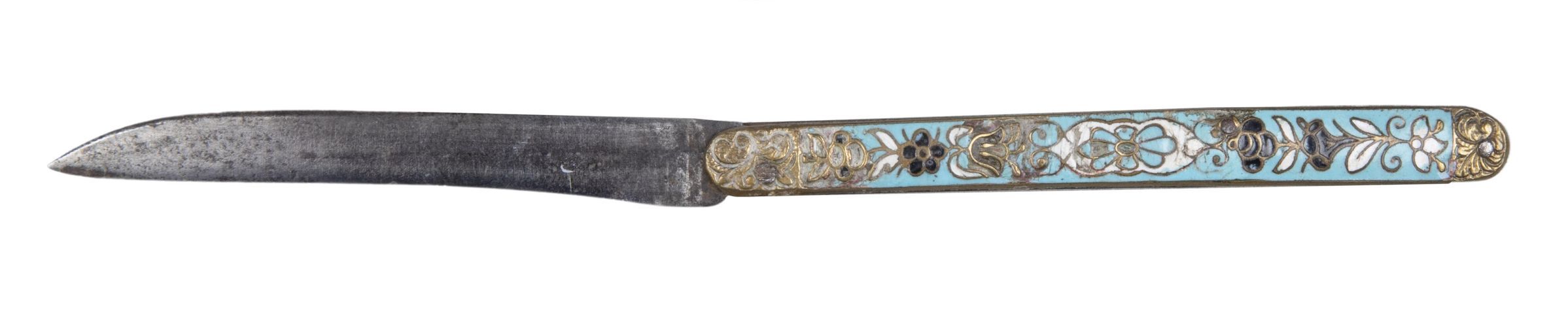 Single-edged, almost parallel sided blade with back curving down to form the point. Handle of cast brass decorated in champlevé enamel in pink blue black and green coloured on a white ground in the Japanese style.Collection