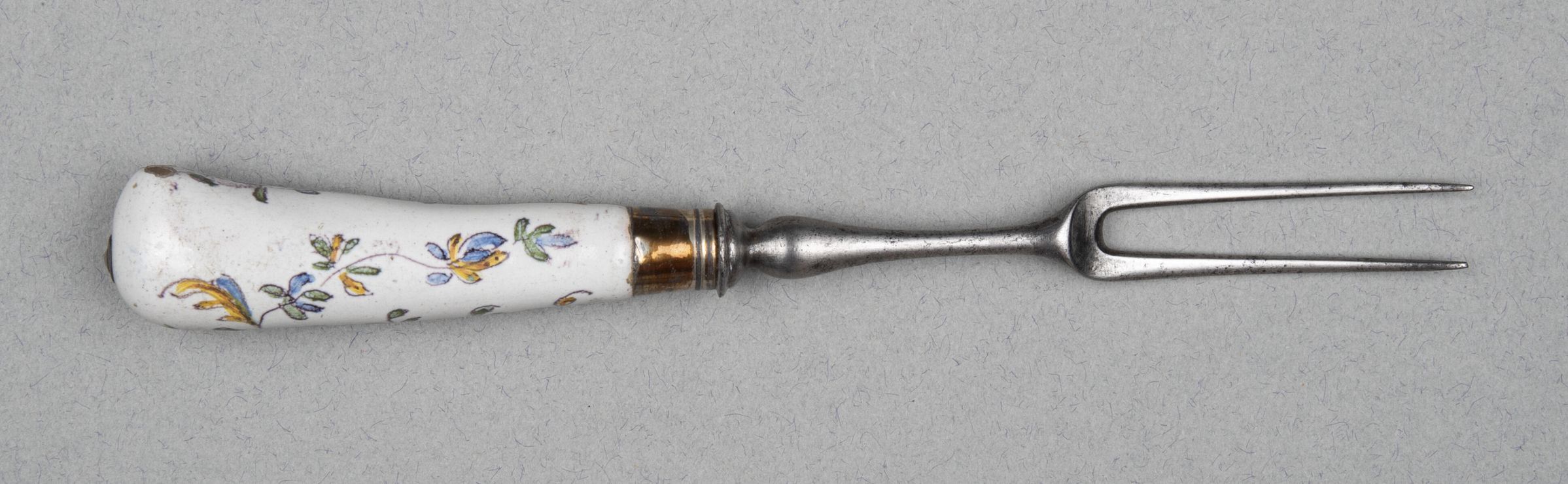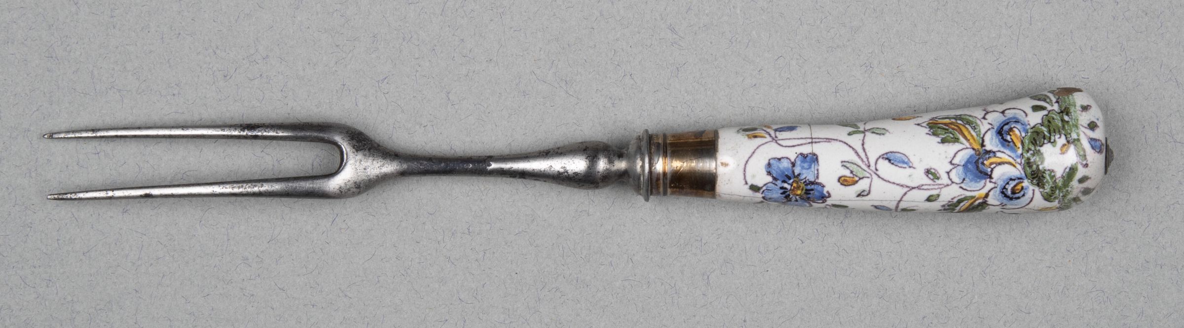 15.02 Two-tined pewter fork, head with baluster-shaped neck. Pistol-shaped handle of faience from Le Nove di Bassano in Northern Italy. Silver Ferrule.Collection