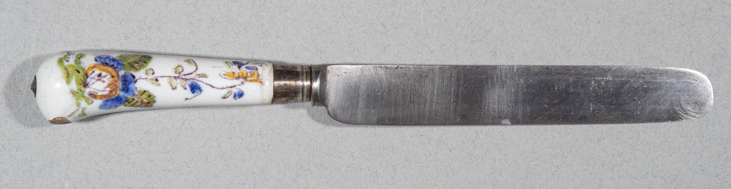 15.01 Straight-sided knife made in England. Pistol-shaped handle of faience from Le Nove di Bassano in Northern Italy. Silver Ferrule