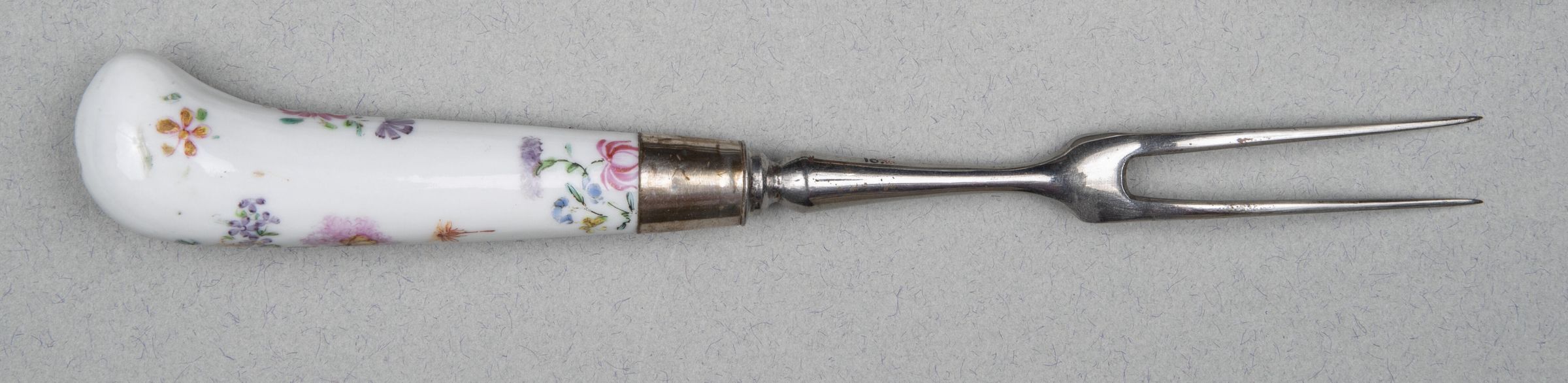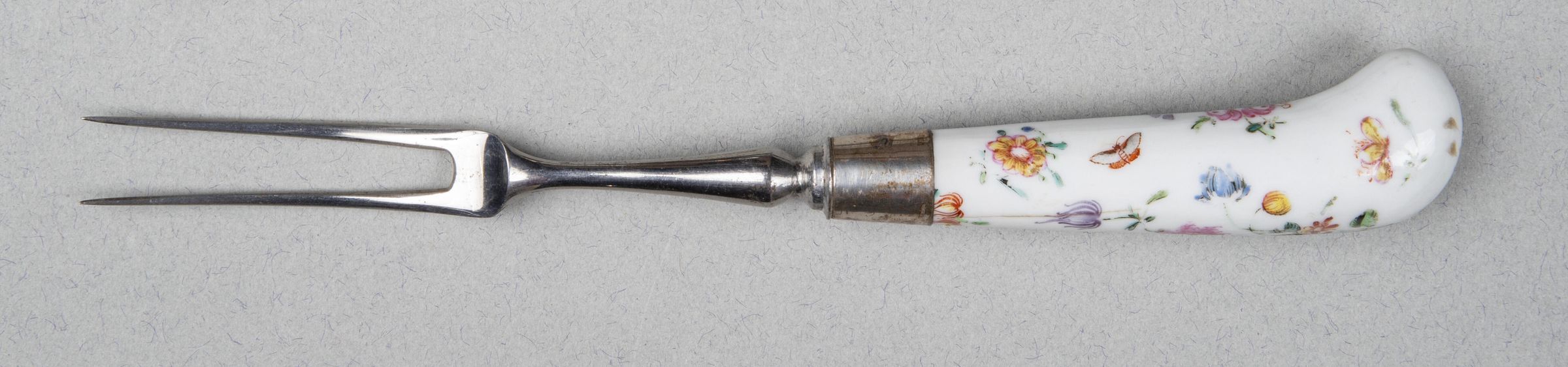 Two long slightly curved tines, the neck baluster-shaped. Pistol-shaped handle of Chinese porcelain decorated in the English floral style. Plain silver ferrule.Collection