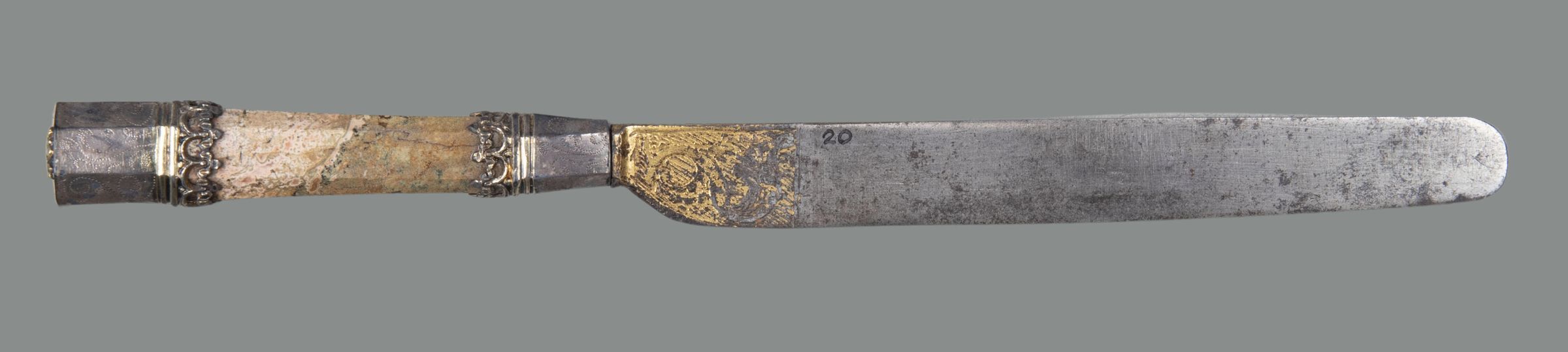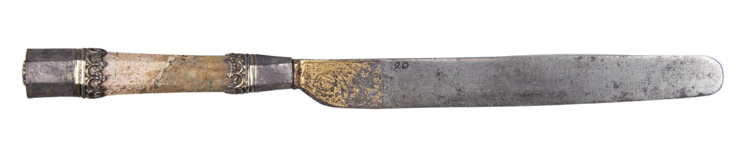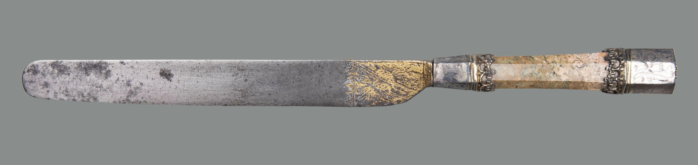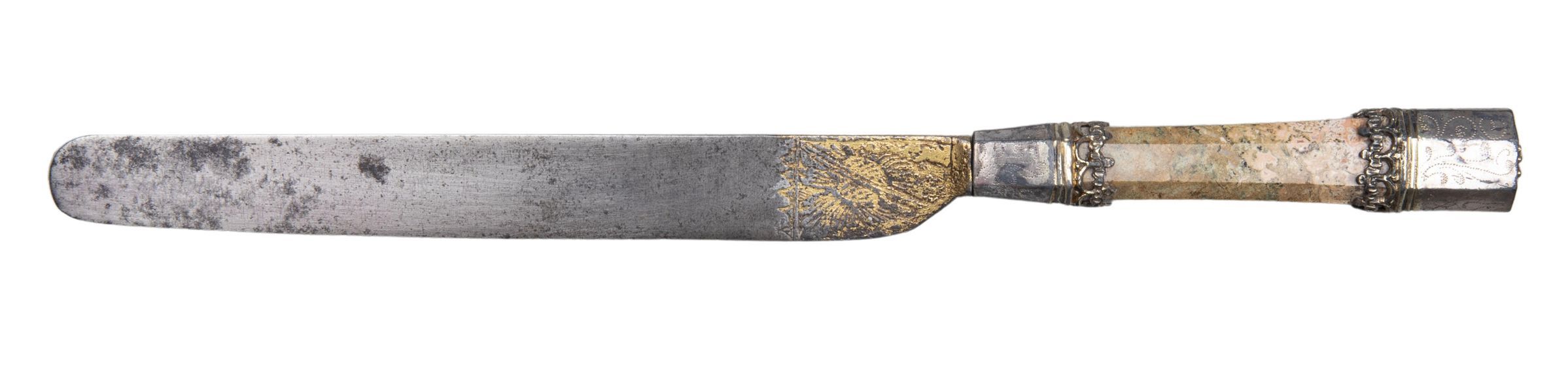 Straight-sided blade with slightly curved edge with an etched and gilded design at the top. Handle octagonal in section flaring slightly to the top, of pink and beige jasper. Flaring ferrule of silver or ? silver gilt. Silver cap with raised floral decoration. Below the cap and above the ferrule is a band of filigree trefoils next to two raised bands. The cap and ferrule are punched with a series of dots in a foliate design.Collection