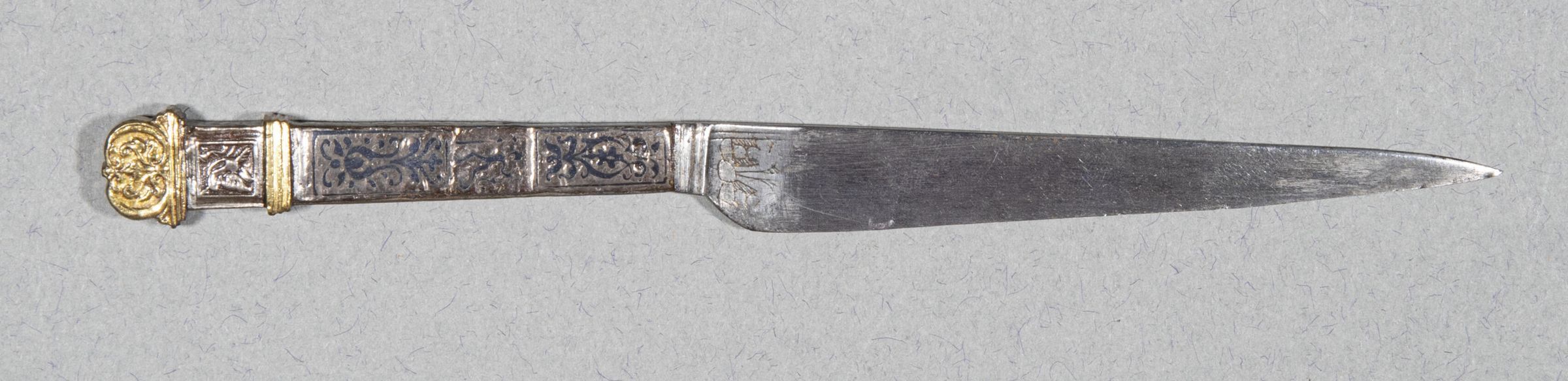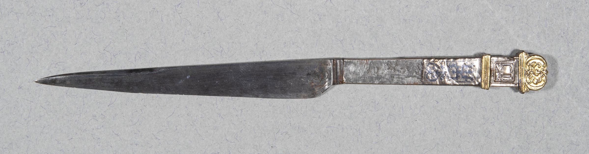 Blade made in one with handle, sharply tapering, with back edge at the point formed by a chamfer on one side and an etched panel of conventional foliage at the base of each face. Flaring rectangular handle close-plated with silver. Nielloed with scrolling leafy ornament and a cupid on the wide sides, engraved with a rope moulding down the narrow sides. The pedestal-shaped finials covered with silver stamped with trophies and anthemion. The end of gilt-bronze. Only one of the broader faces retains all its silver plating.Collection