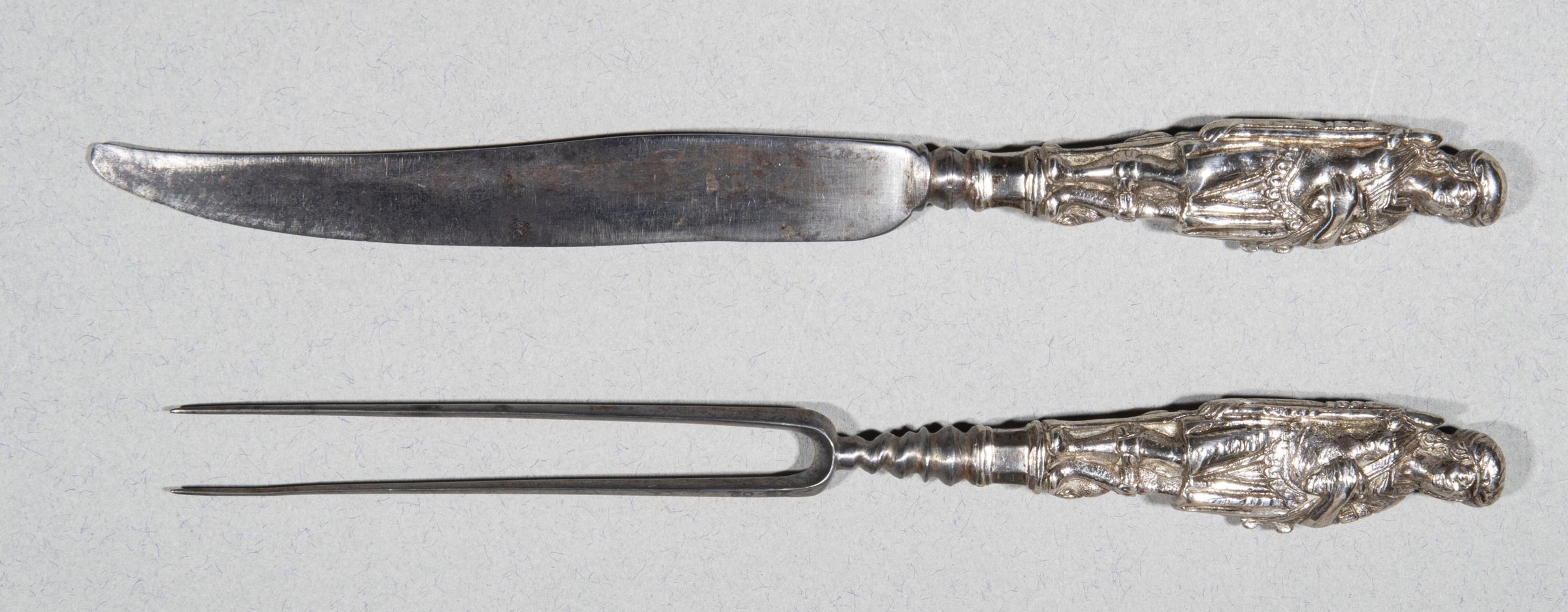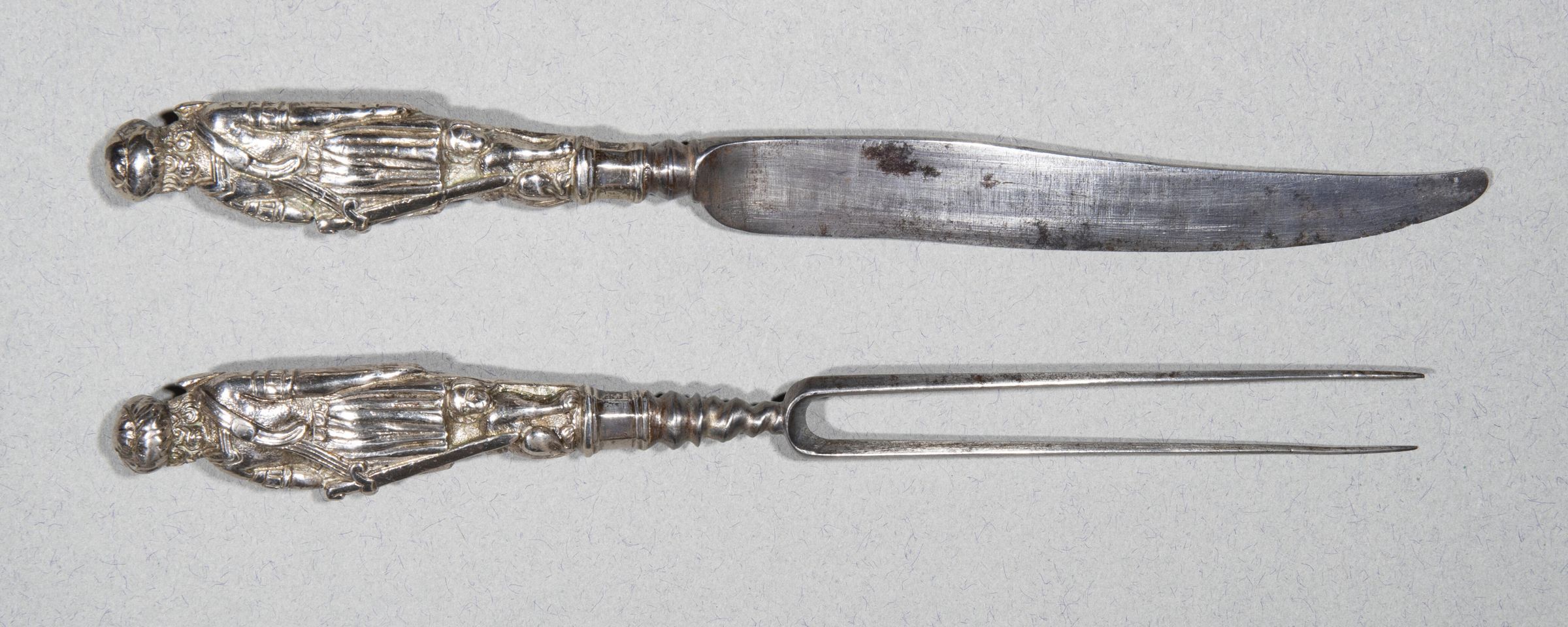 25.01 Knife: Sabre-shaped blade, much ground down towards the point with bolster of flattened spherical shape. Silver handle, cast and chased as a young huntsman wearing pseudo-Roman costume with a turban and a sword on a shoulder helt, standing on a low octagonal plinth. He holds a spear vertically against his body with his right hand and a hunting horn against his chest with his left: a hound sits on the ground behind his legs.