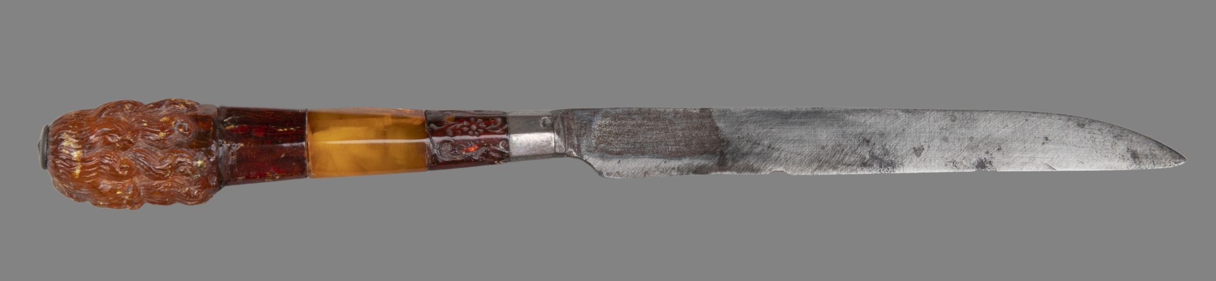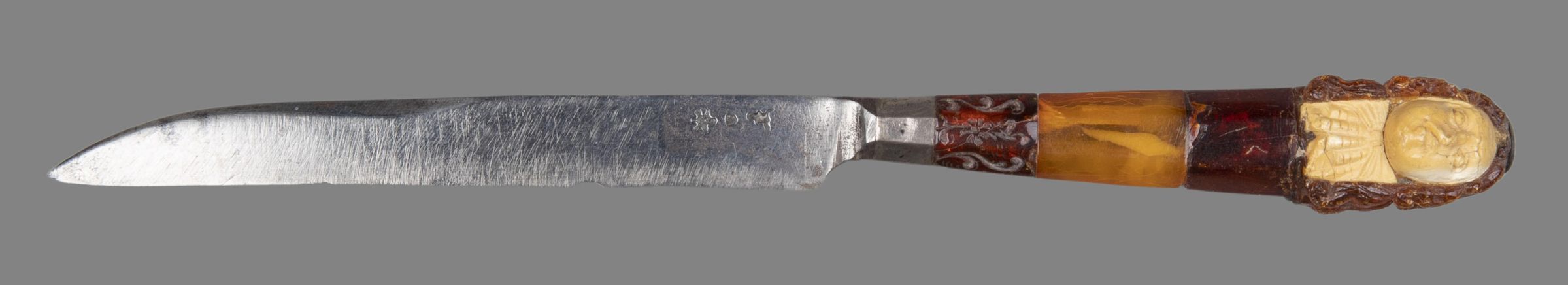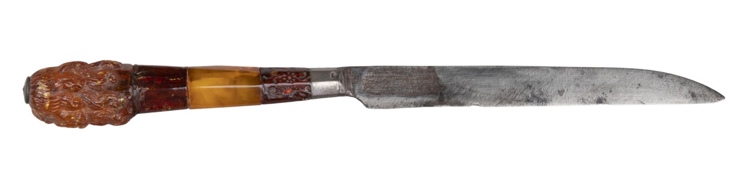 Handle: Silver-mounted of two different kinds of amber in three sections, the lower section partly incised with foliage and flowers, the central part of a lighter colour and the upper part containing the bust of a man in late 17th century costume carved in meerschaum or ivory except for his long periwig which is in amber.Collection