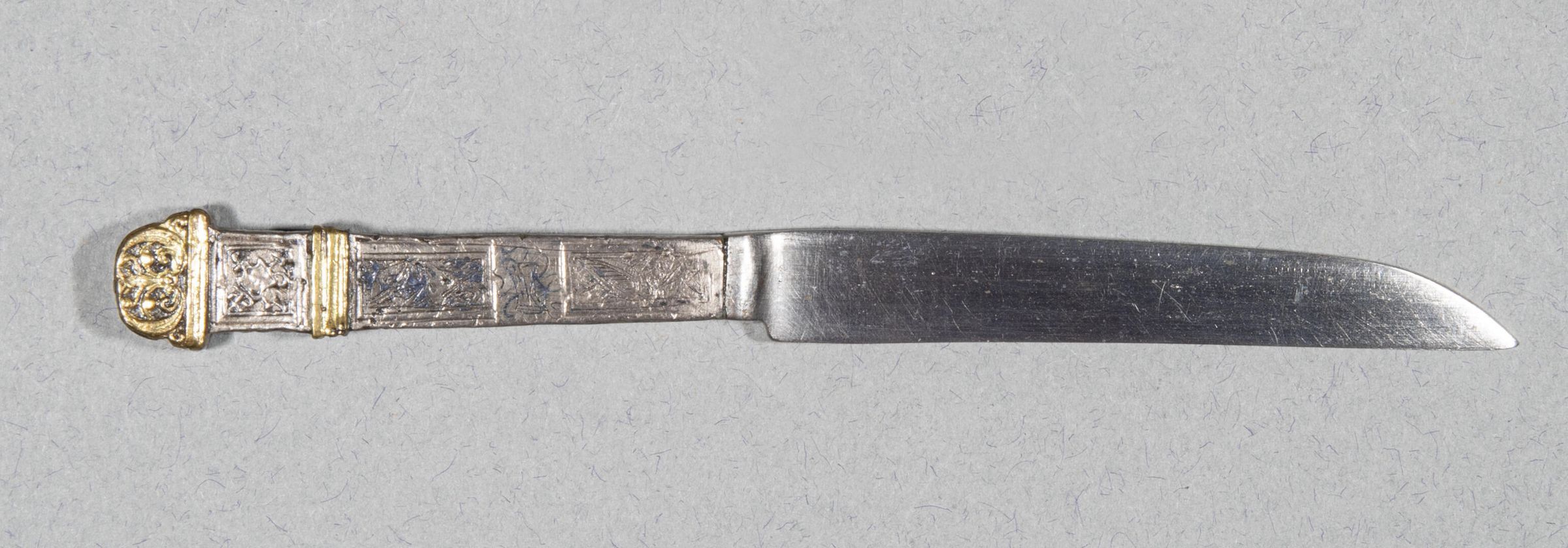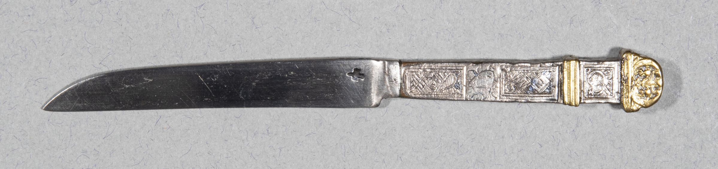 Blade made in one with handle, with both parallel edges straight and the upper tapering sharply at the end to the point. Handle similar to 23.01 except that the sides are all engraved and represent musical instruments. (23.01 has: 'etched panel of conventional foliage at the base of each face. Flaring rectangular handle close-plated with silver. Nielloed with scrolling leafy ornament and a cupid on the wide sides, engraved with a rope moulding down the narrow sides. The pedestal-shaped finials covered with silver stamped with trophies and anthemion. The end of gilt-bronze.')Collection