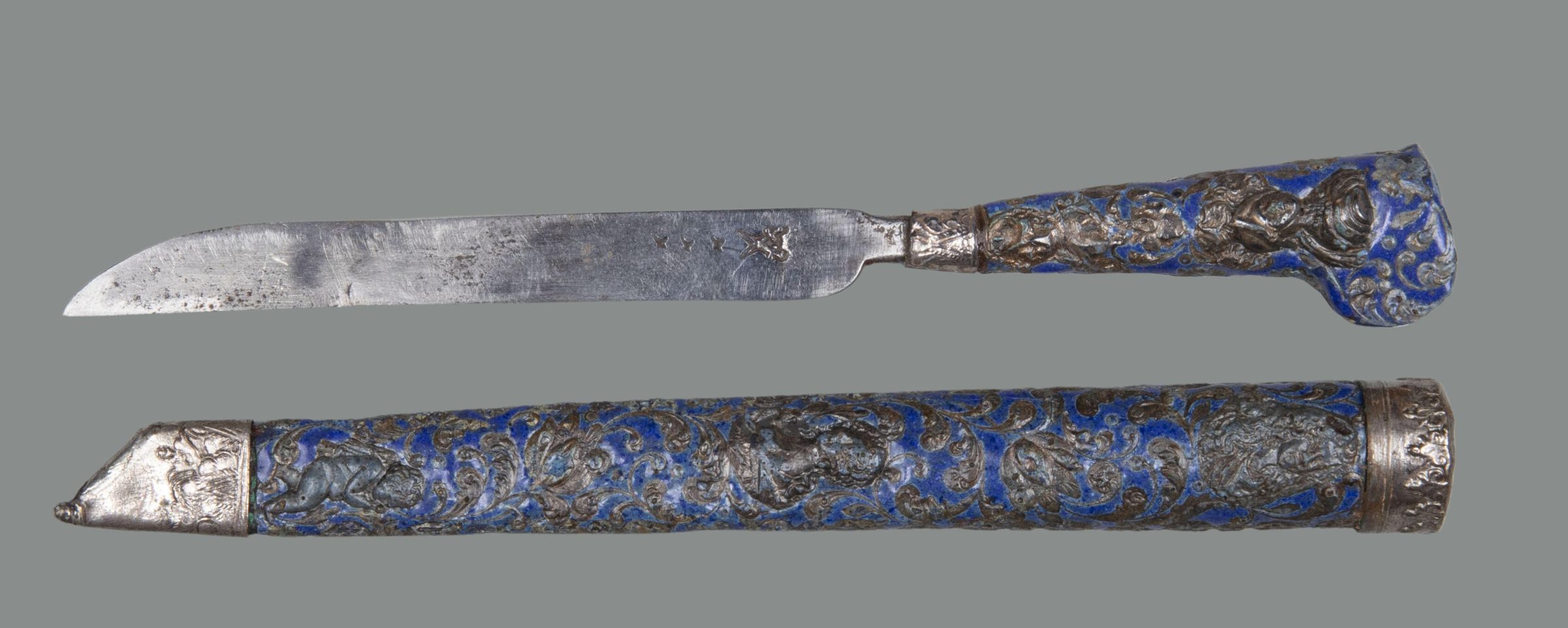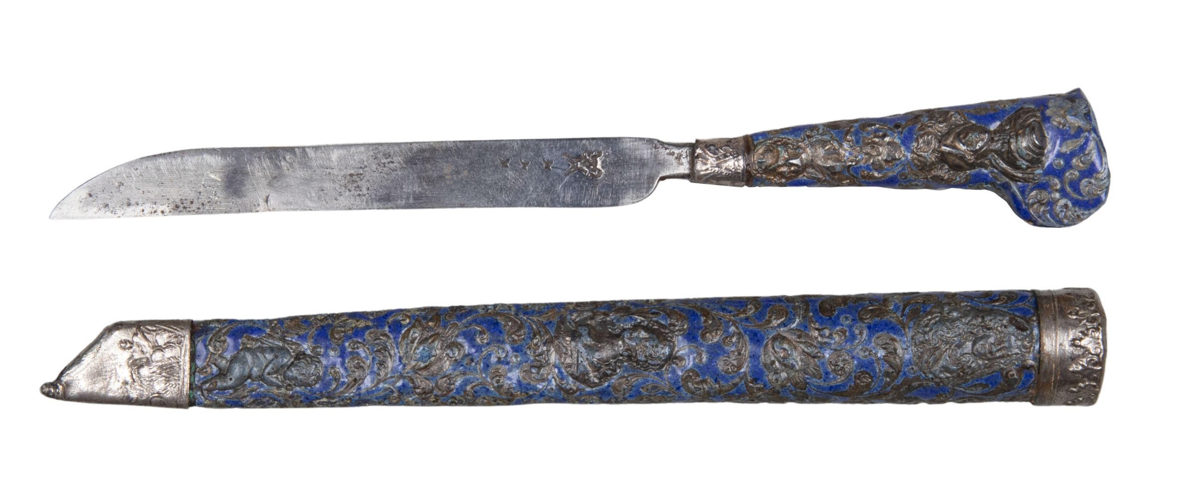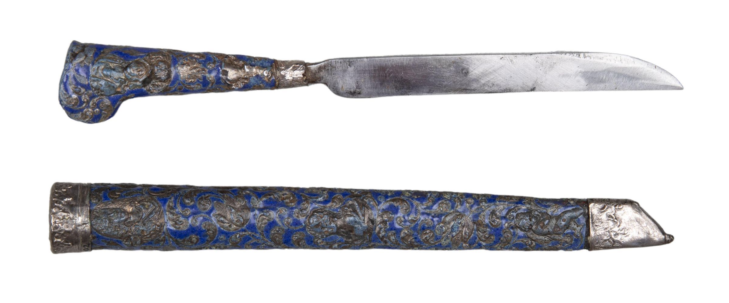 72.01 Knife: Blade straight-sided, the upper edge tapering toward the point. Handle of flaring shape, with a projecting ear on one side; it is of mid-blue colour enamel on copper, surrounding stamped silver floral scrolls, rosettes, knights, and ladies; the ferrule is of silver, stamped with a pattern of alternating chevrons and acanthus leaves.