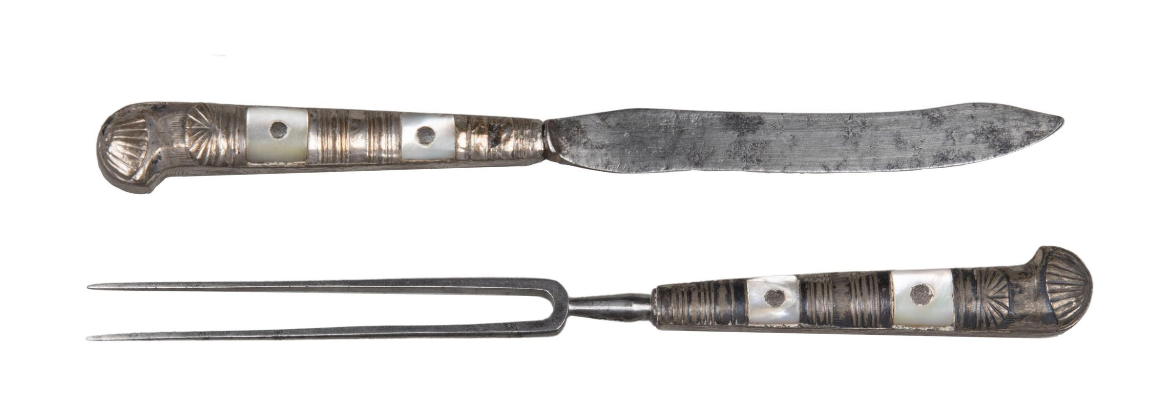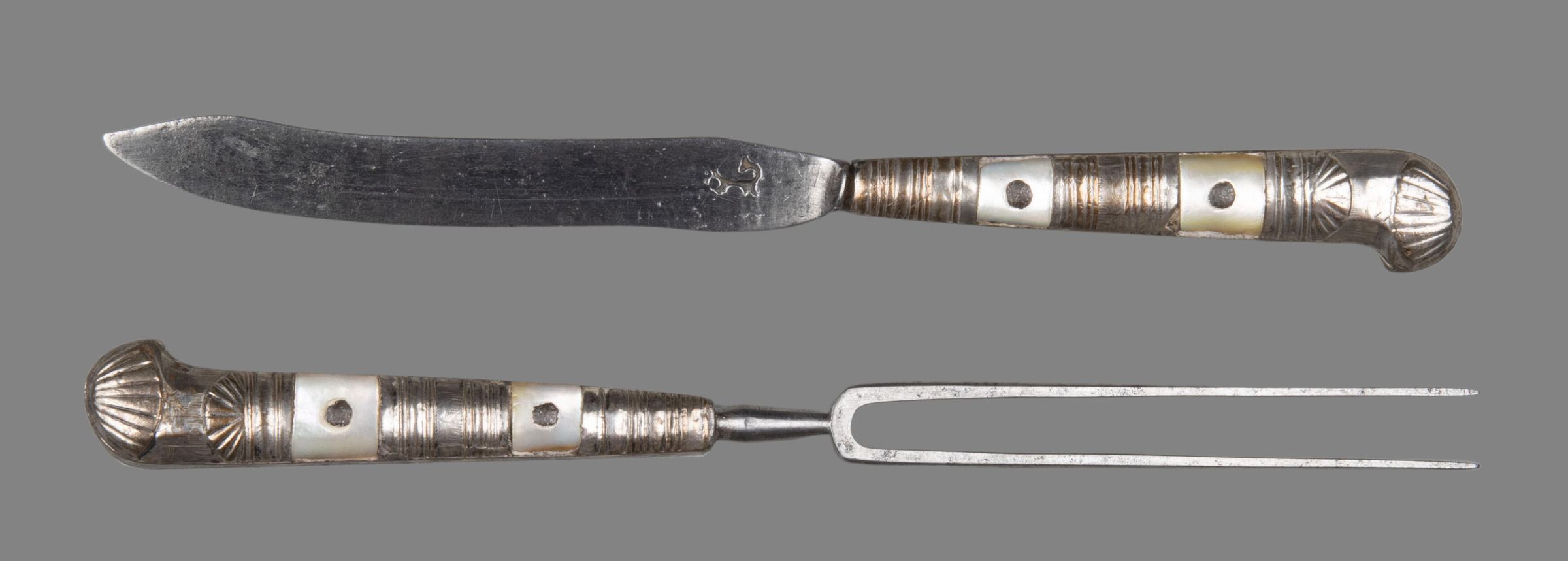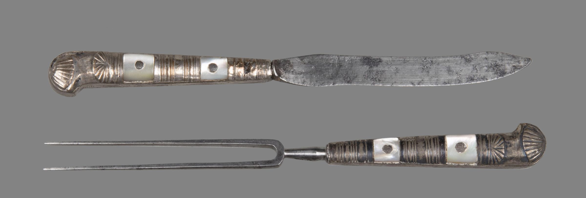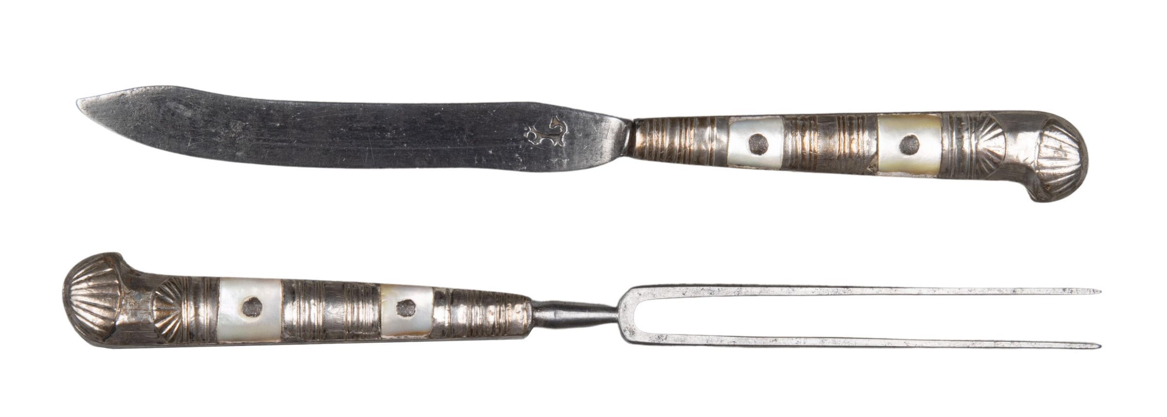 Handles: Tapering, of loaded silver, beaked on one side of their rounded tops, with convex sides and flat edges: each side is set with two rectangular mother-of-pearl plaques, rivetted in place, and decorated with transverse raised ribs and stylised scallop shells; the edges are sketchily engraved with conventional foliage.Collection