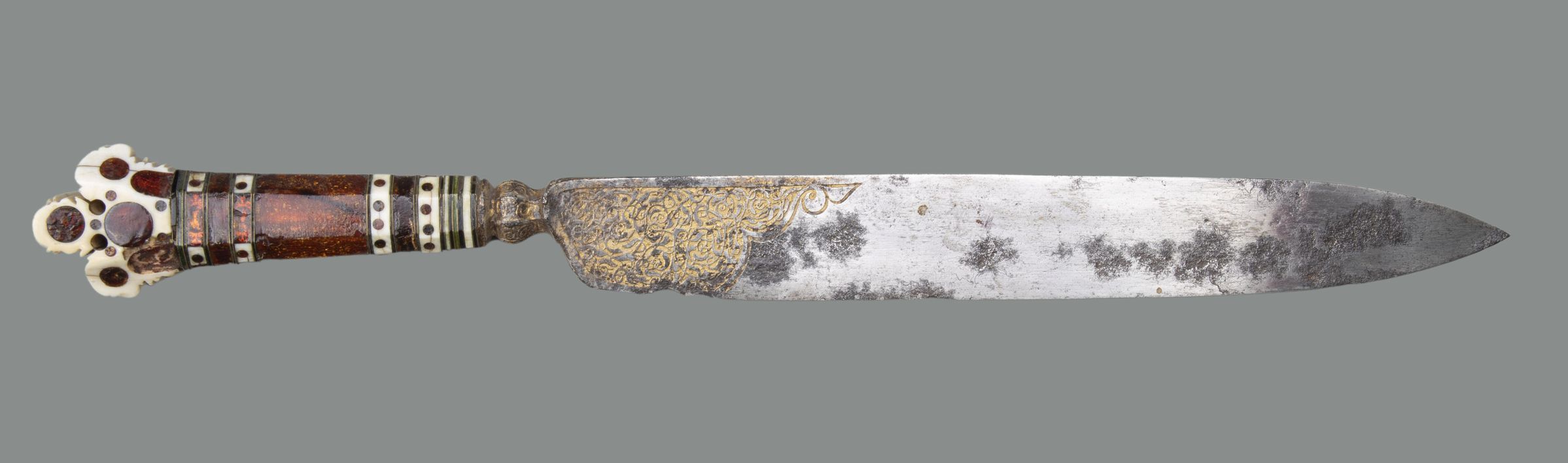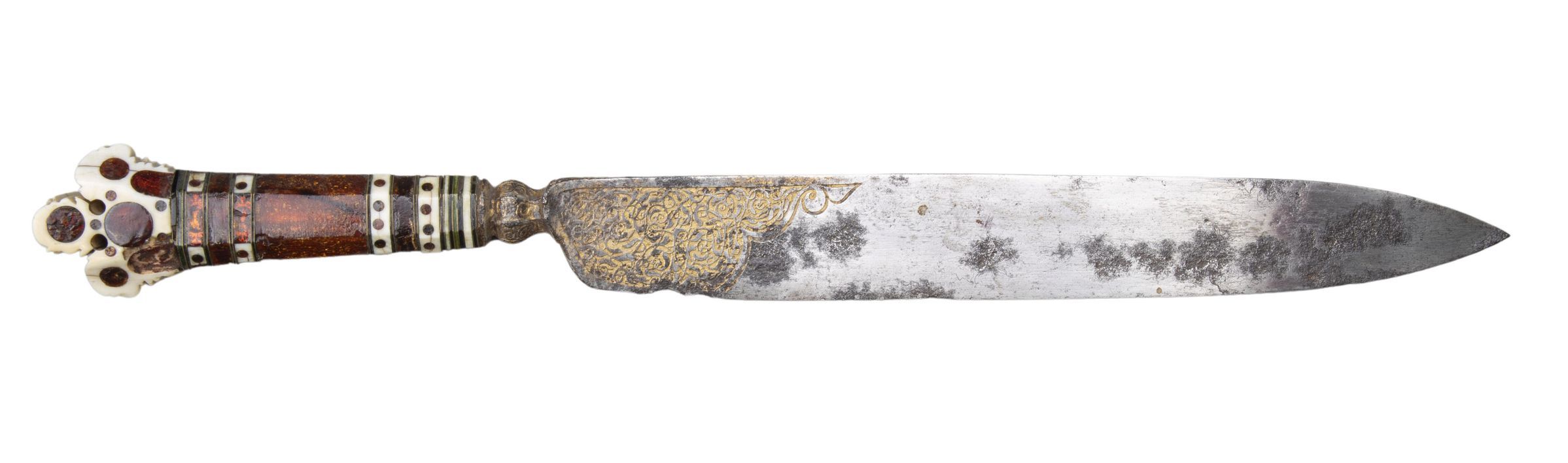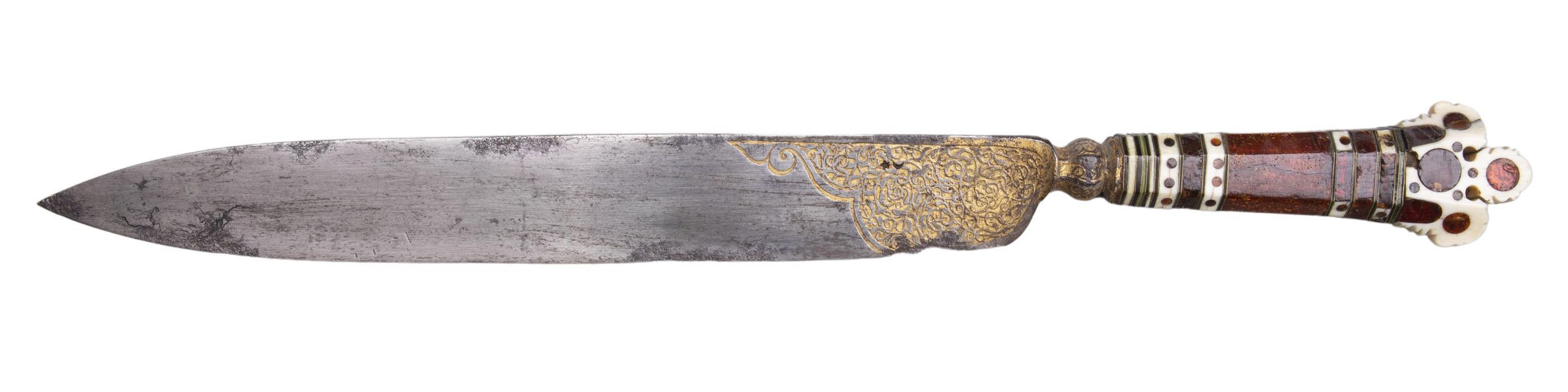 Blade: Leaf-shaped with short baluster-shaped bolster of octagonal section; the base partly etched and gilded on each face with a shaped panel of arabesque scroll-work which extends onto the bolster.