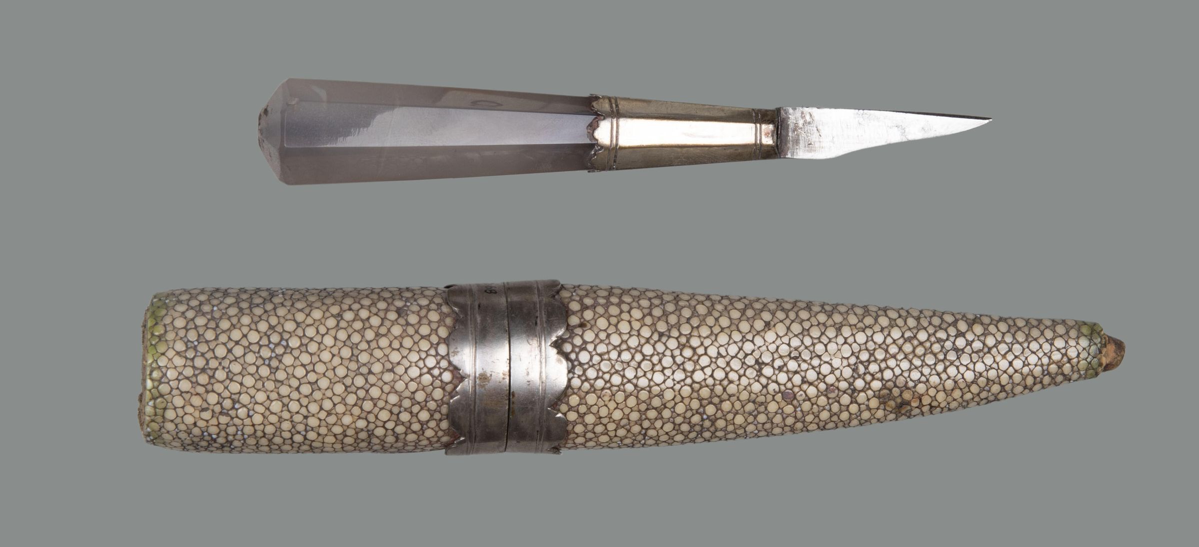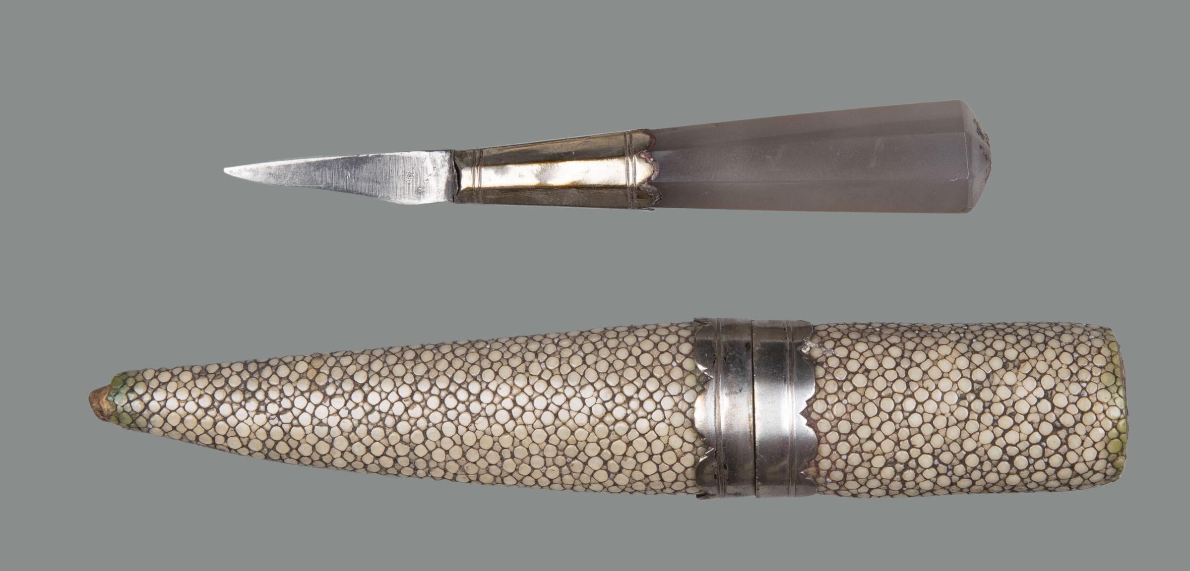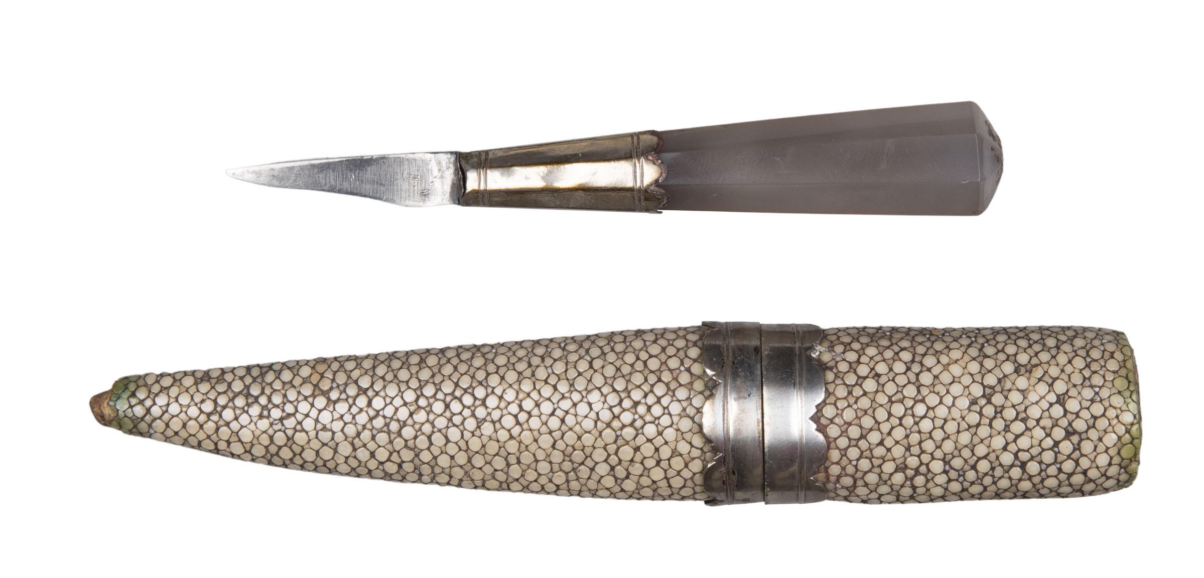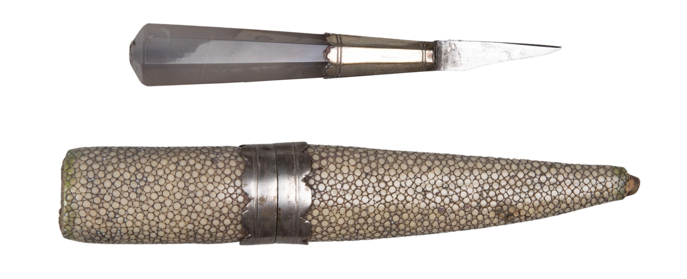 89.01 knife: Blade short and sharply pointed, almost triangular, single edged. Handle tapering, of agate, octagonal in section, with deep silver ferrule, bordered at top and bottom by pairs of engraved leaves, the upper edge scalloped; the top of the tang originally fitted with a washer (missing).