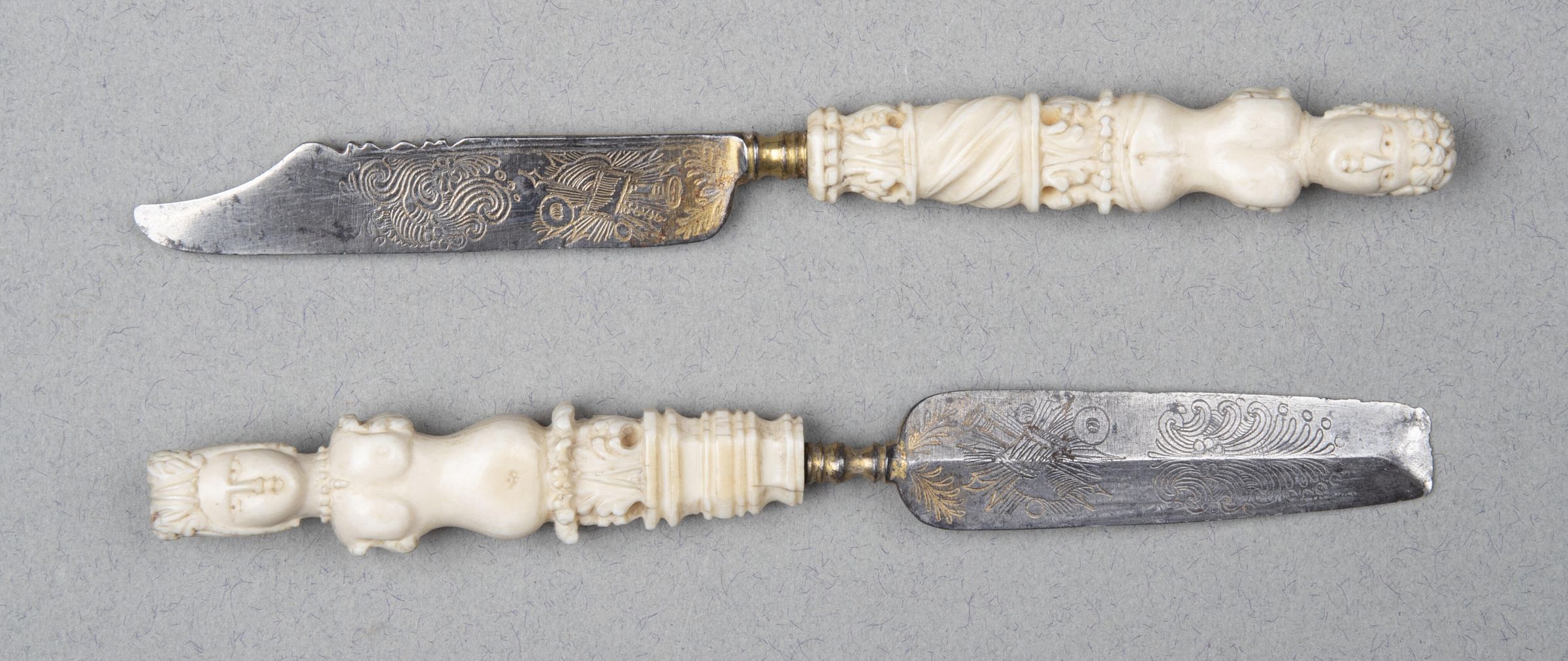 99.01 Knife: Double-sided short chisel-shaped blade for erasing with a baluster-shaped bolster. Etched and gilt near the handle on once face with a panel containing flowers, the other face a trophy of musical instruments below a motif of rococco scroll-work.