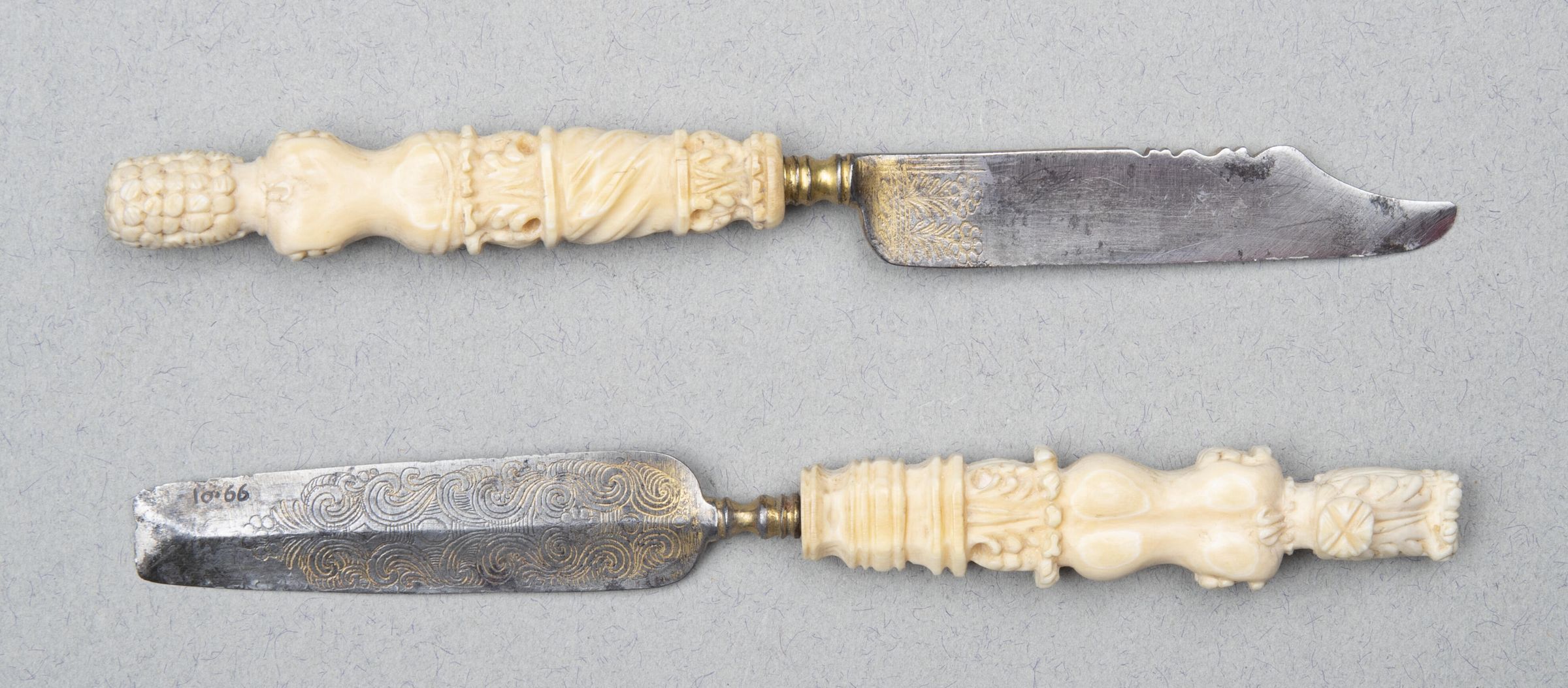 99.02 Knife: Straight-sided, the upper edge chiselled with a decorative pattern and becoming concave towards the point. Etched and gilt near the handle one face with a symmetrical arrangement of scrolls and a trophy of musical instruments, the other face with two daisies and an asymmetrical scroll combined with another trophy.