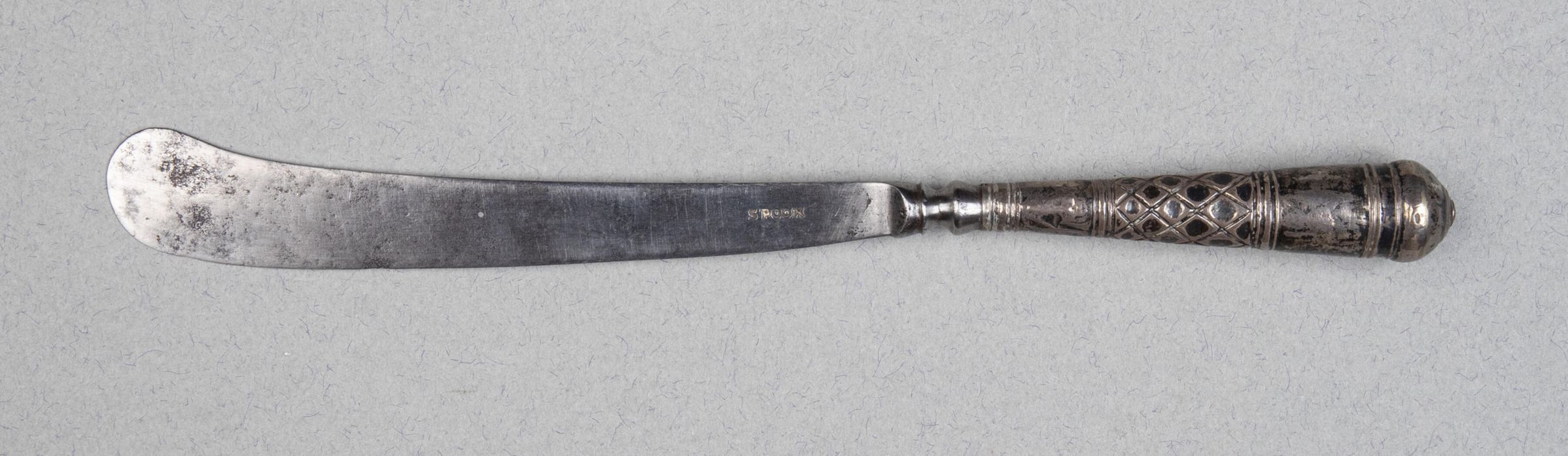 Scimitar-shaped blade with waisted bolster. The loaded sheet-silver handle flaring and circular in section, with a deep band engraved with diapering between reeding, and a domed end.Collection