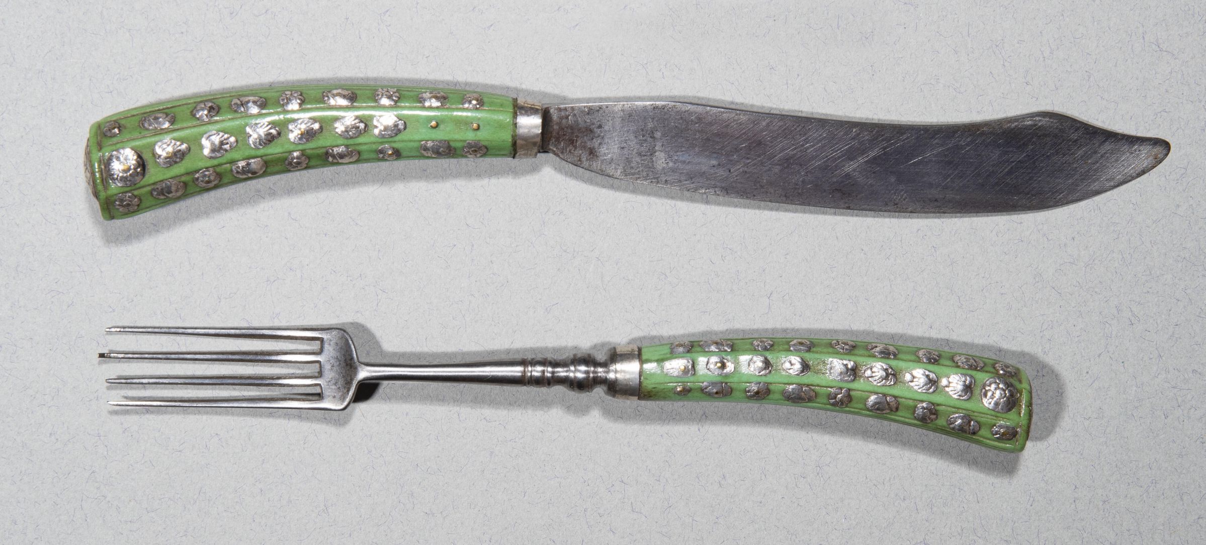 Handles curved and tapering of green-stained ivory, with striated lines of decoration, and applied small silver ornaments in shapes like shells and flowers; flat tops with large rose washers.Collection