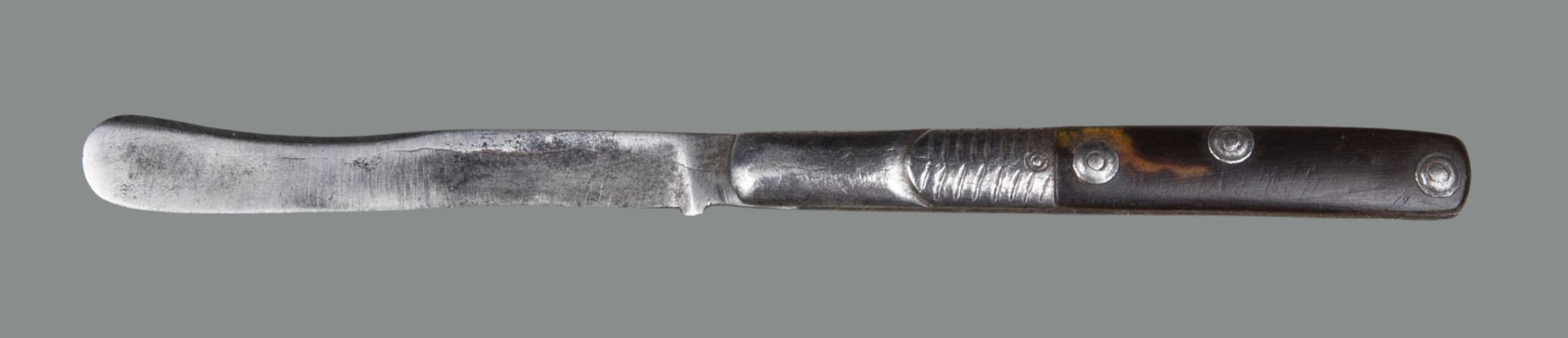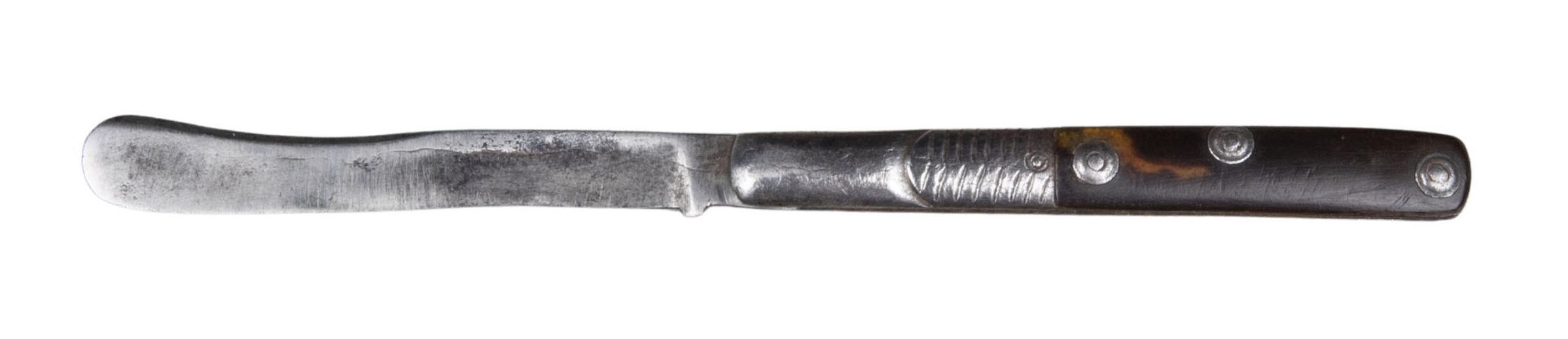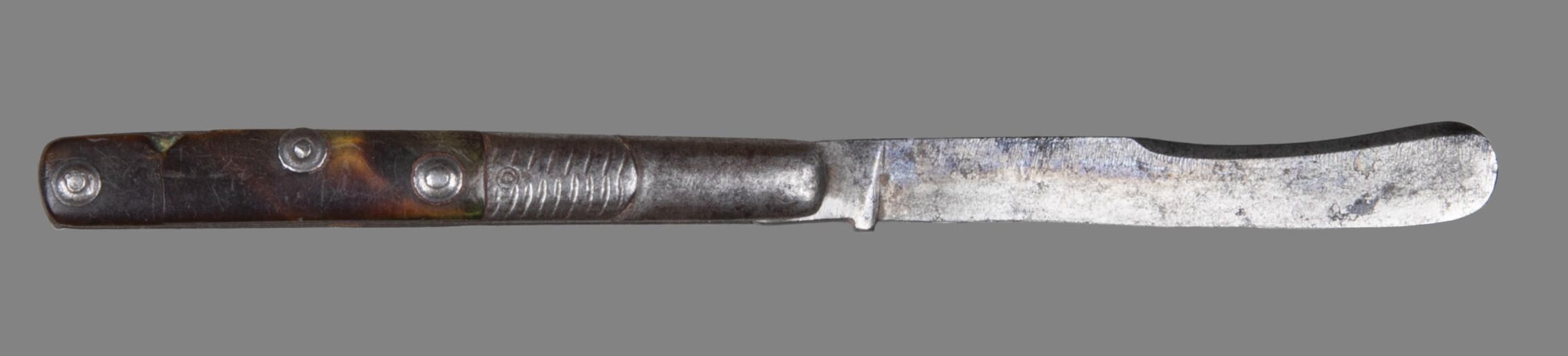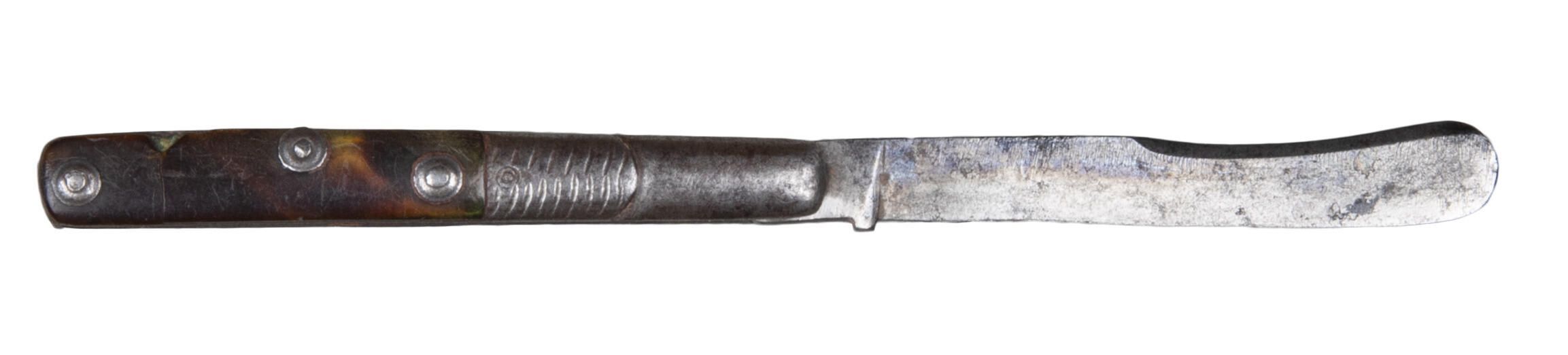 Blade slightly spatulate and single-edged with a rounded point and slightly concave back-edge for half its length. Narrow oblong steel handle with slightly convex sides, the front of each with a raised feature engraved with a herringbone pattern, the near half being recessed for a tortoiseshell scale held by three boss-headed rivets.Collection