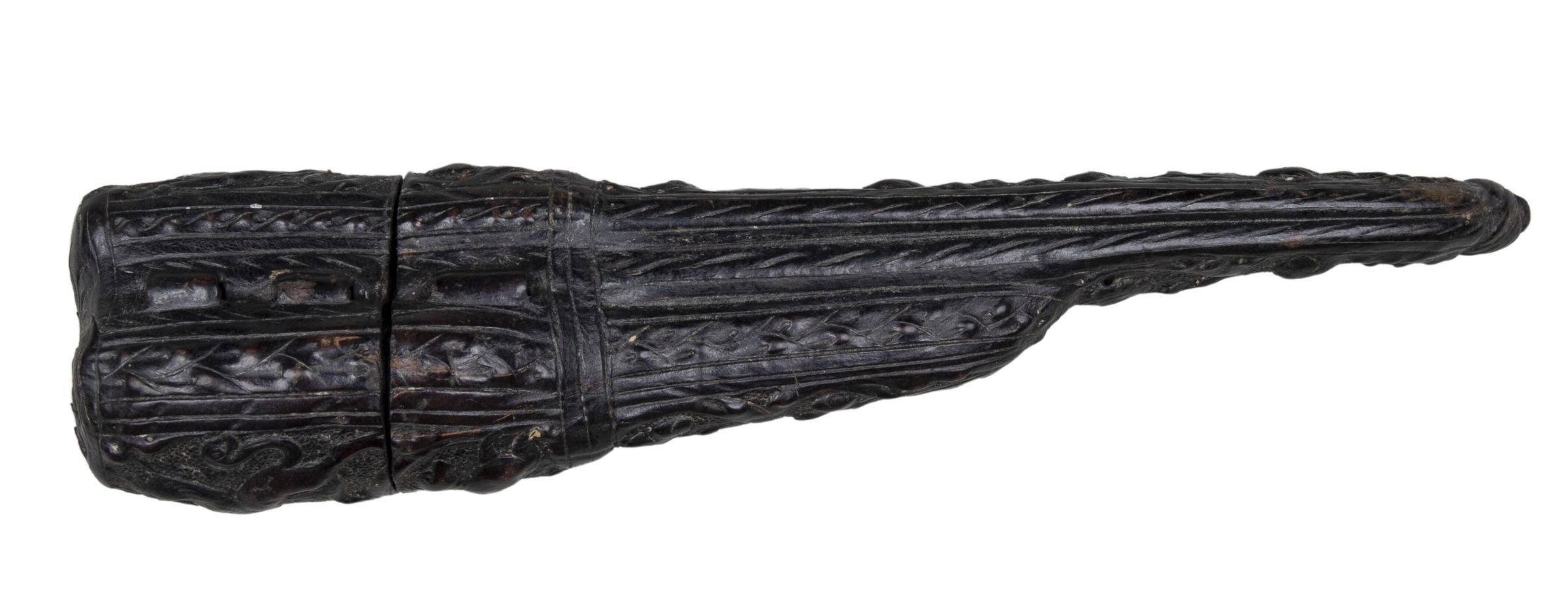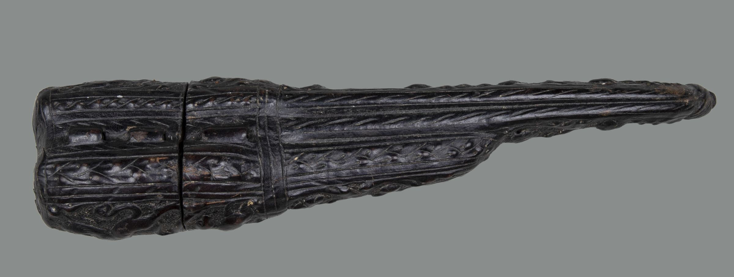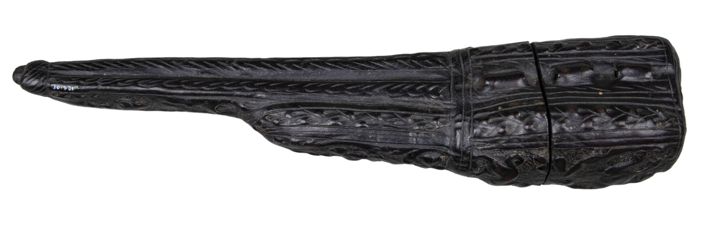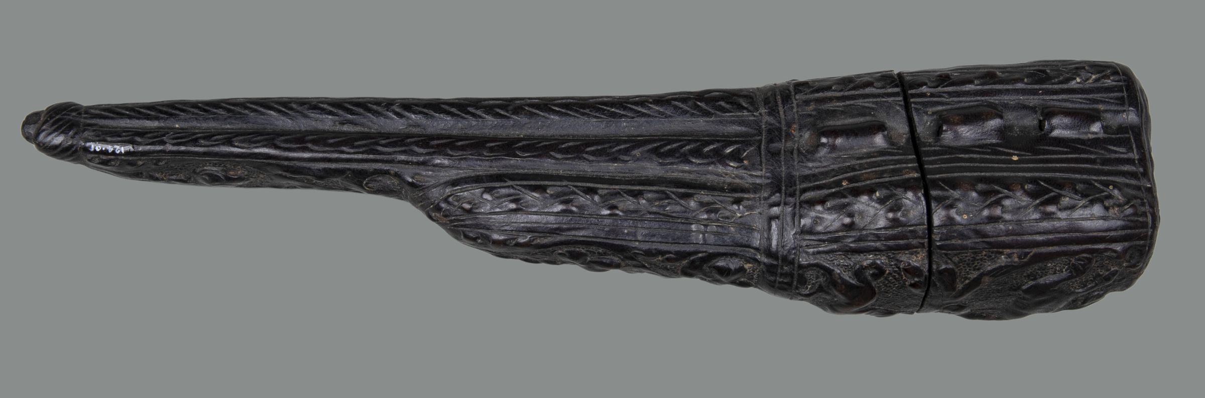 Sheath made of 'cuir boulli' (leather boiled to soften and shape it) incised and embossed with leaves and scrolls. Decorated with animals; probably rampant lions and a dog, scrolls and fleur-de-lys.Collection