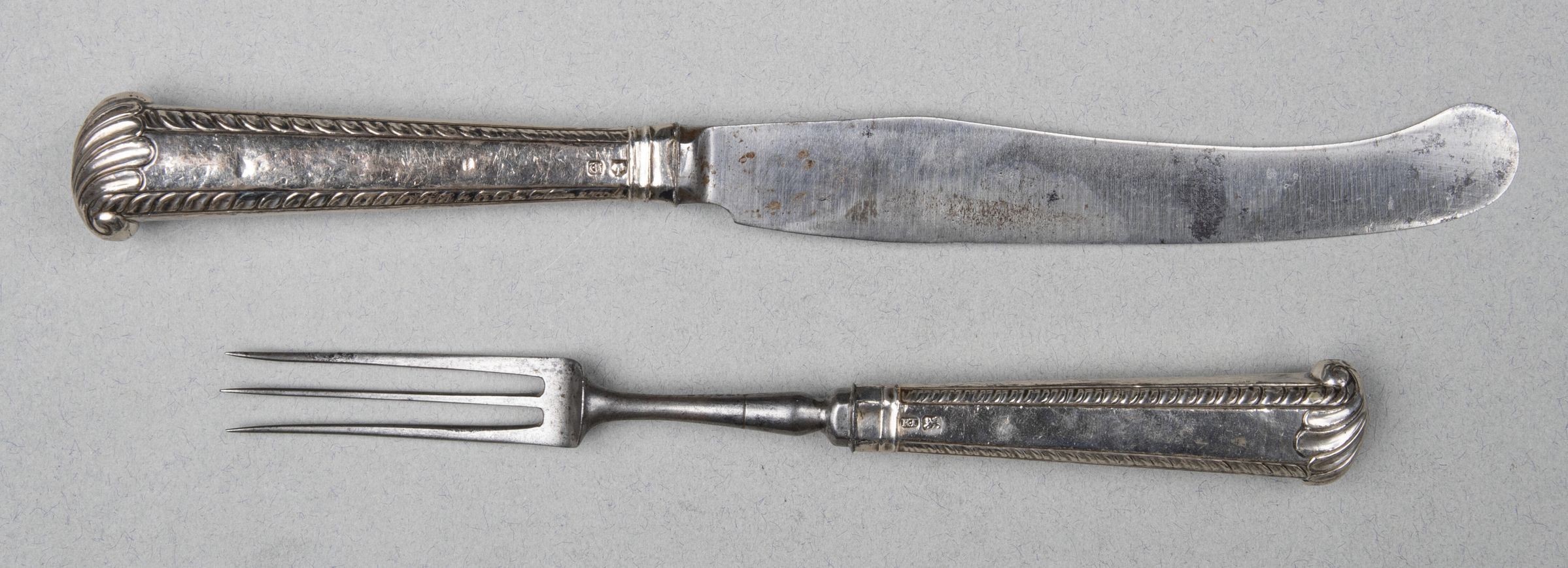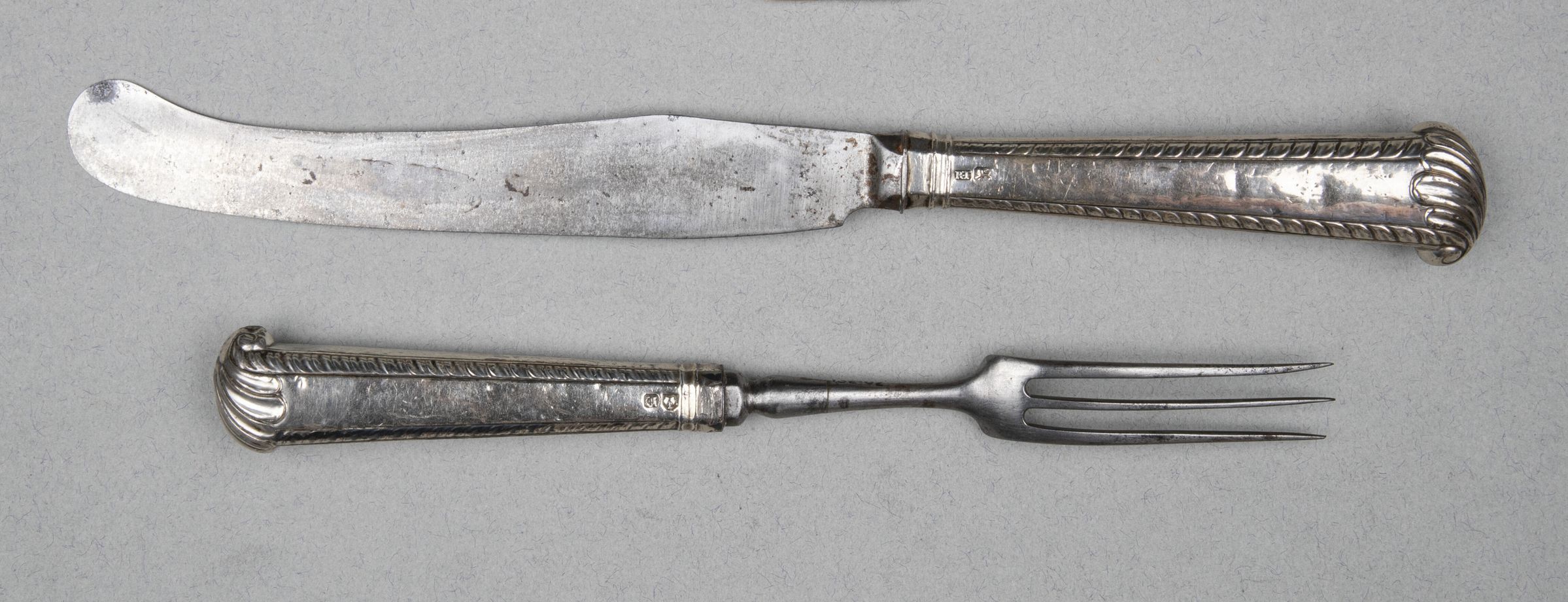Handles : Stamped and loaded silver, flaring in shape, a chamfered rectangle in section, with feathered corners and shell ends (see drawing by Anne Jenner, below).Collection