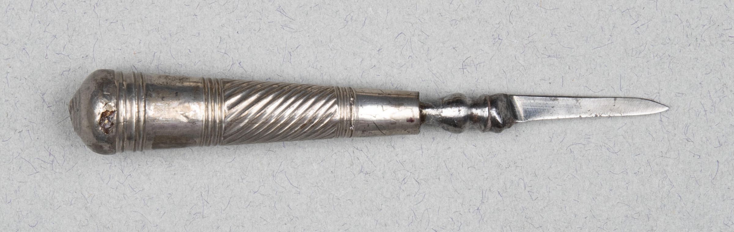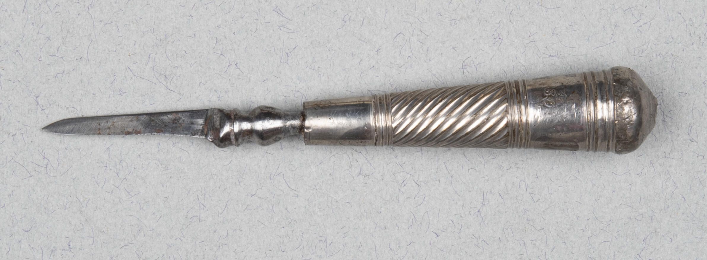 The blade short and tapering with a pronounced baluster-shaped bolster. The loaded silver-sheet handle flaring and circular in section, with a deep band of spiral flutes between reeded bands.Collection