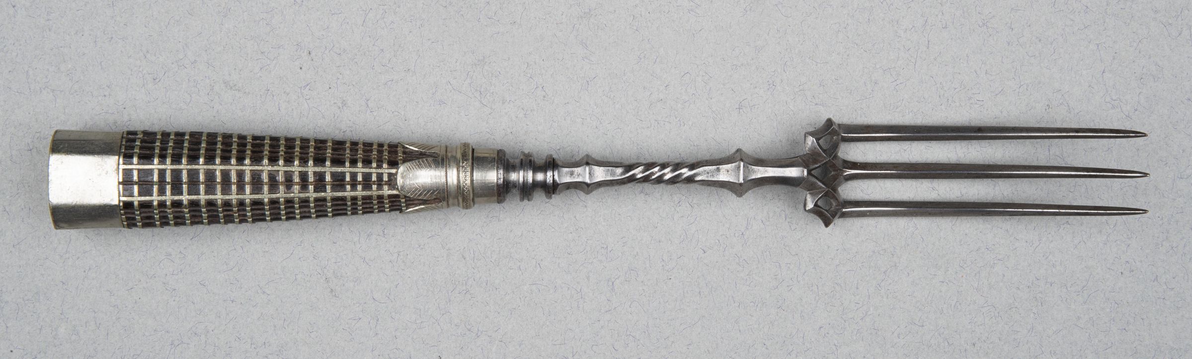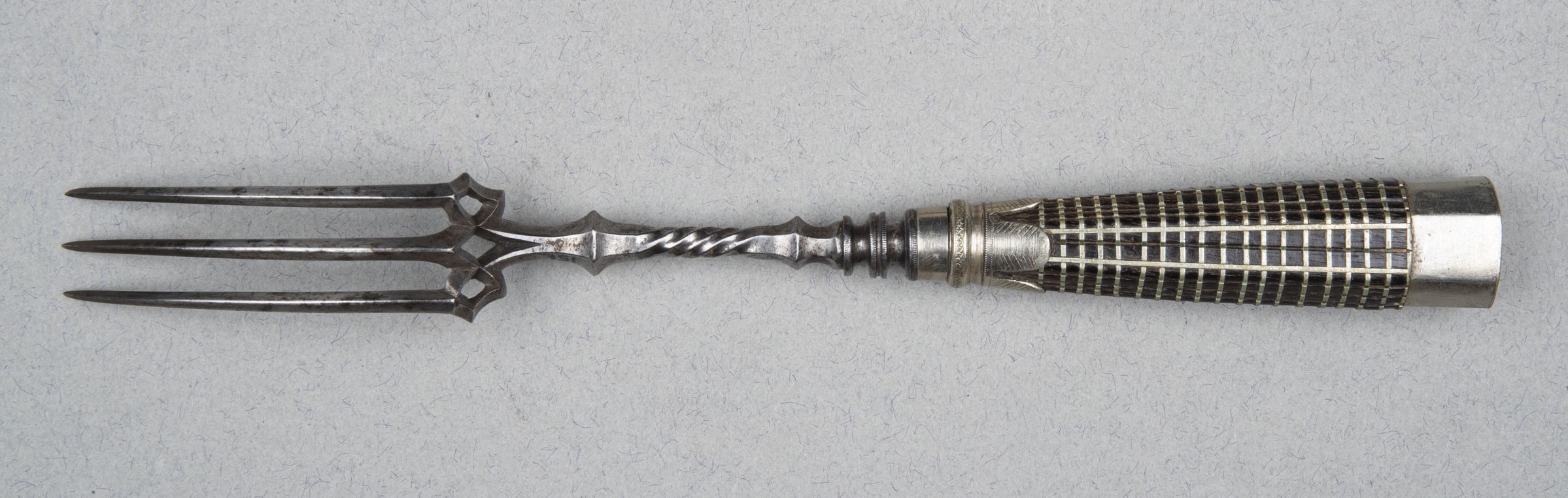 With three curving tines and elaborately chiselled and wrought shoulders. The fork head has 3 holes cut into it, above the tines. The flaring octagonal handle of ebony and horizontal bands of silver and four vertical strips. The silver ferrule with foliated, deeply scalloped edges. The cap silver and flat topped.Collection