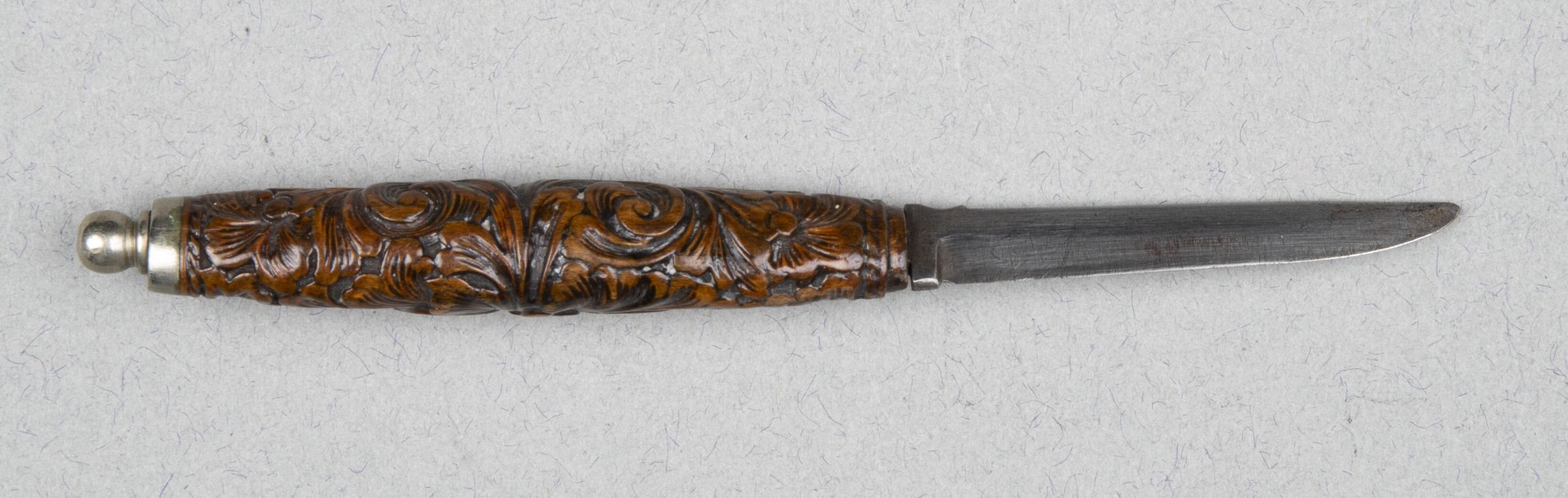 Desk pen knife with a carved boxwood handle, mounted in German silver. This may be a miniature version of the typical Swedish or Finnish sheath-knife, rather than a pen knife, made in the 19th century.Collection