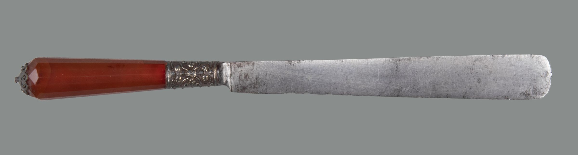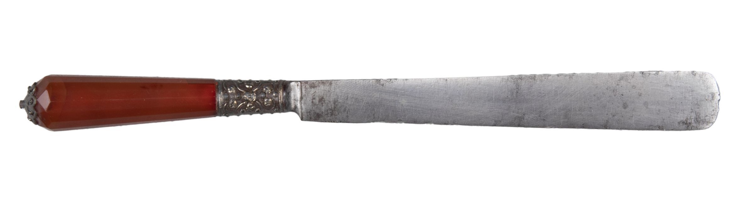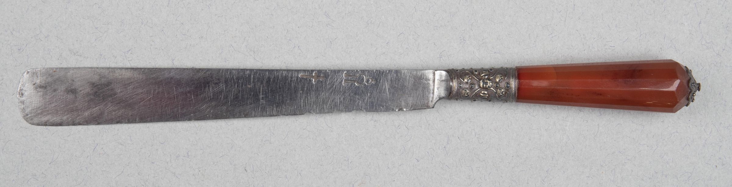 Blade flaring, with wedge-shaped tip and hollow bolster; the shoulder of iron encrusted with cherubs' heads and ball-flower in silver. Handle of cornelian, flaring, and multi-facetted in section, with a silver-gilt filigree rosette-shape finial.Collection