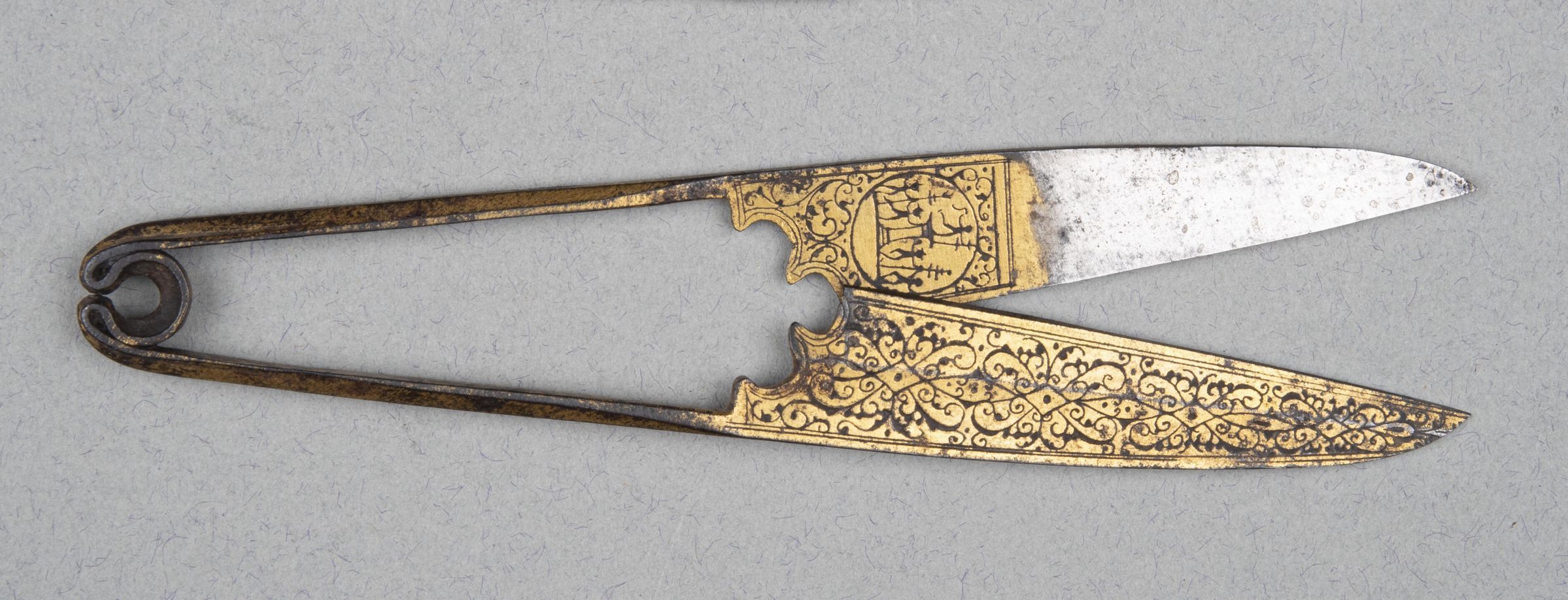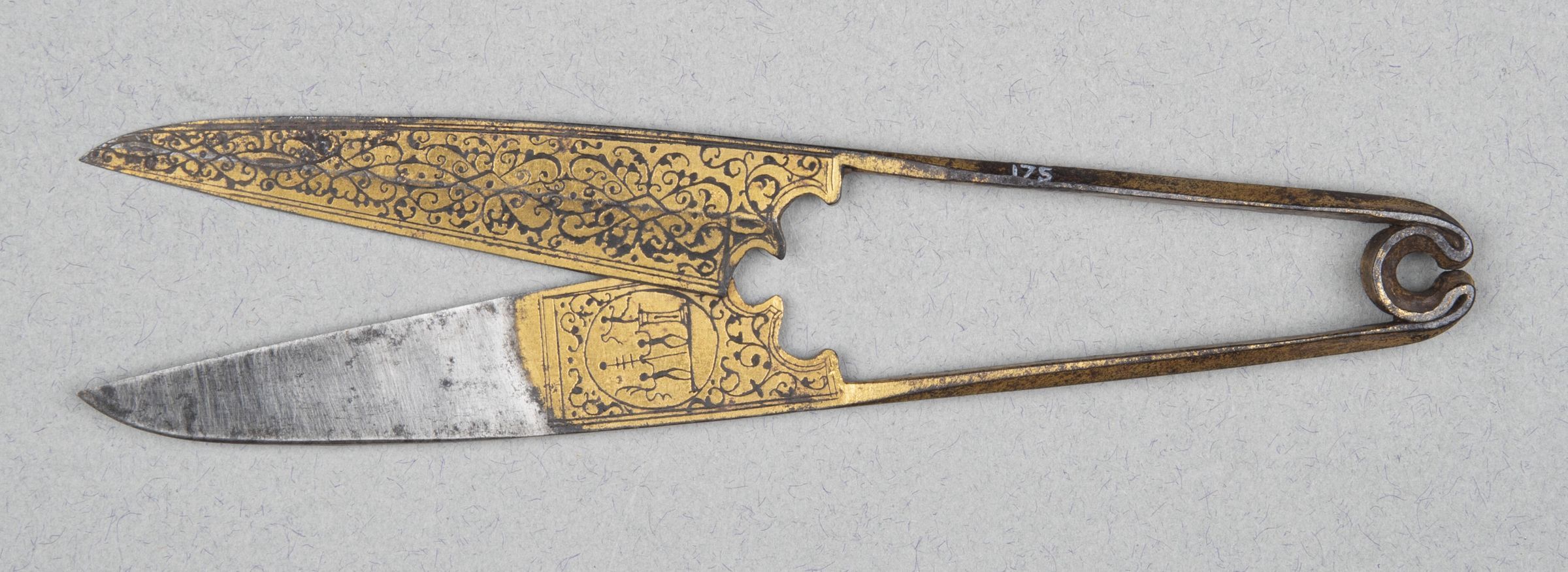 Blades straight edged with backs curving sharply back to a point, each with long spring steel neck. Each etched and gilt with floral and scroll decoration externally. At the top of the blade on the inside in a rondel are 2 stick figures dancing with a pole and a third figure on a pedestal. Inside the other blade, also in a rondel, are 4 stick figures with two poles, dancing round a fifth figure on a pedestal.Collection