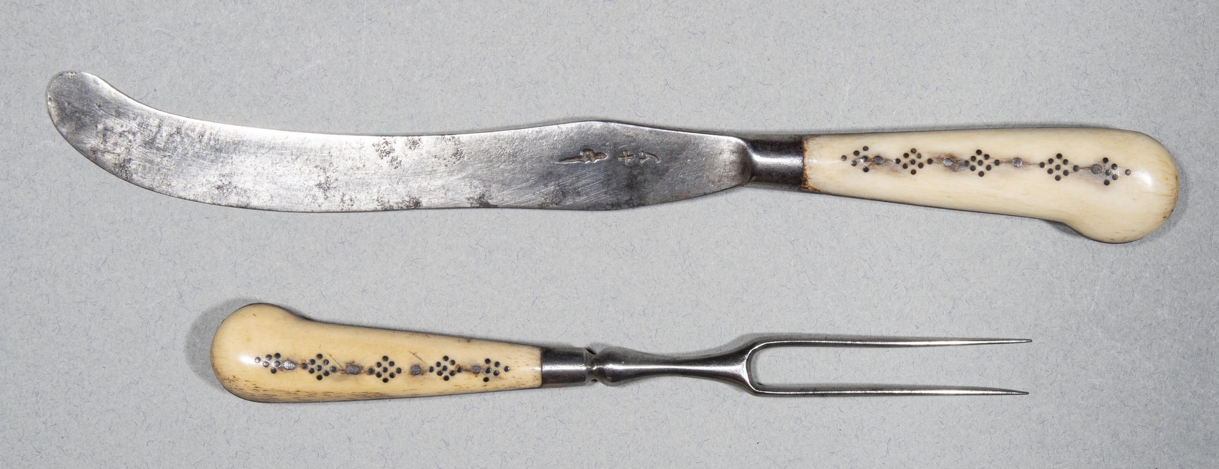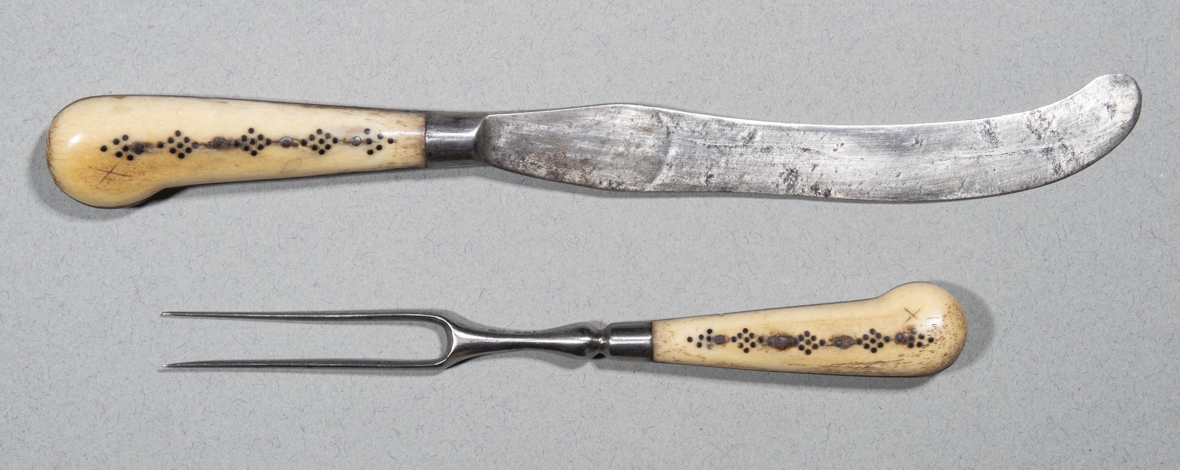Handles: Iron, pistol shaped, with bone scales each fixed with four iron rivets, between five diamond-shaped patterns of black dots.Collection
