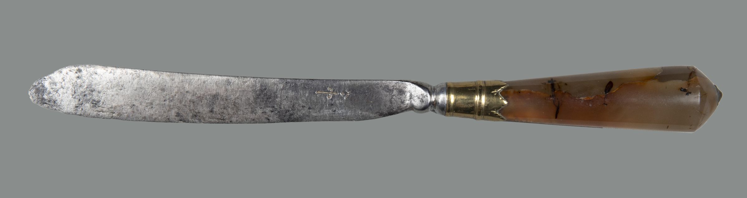 A knife with an agate handle with a silver washer at the top. The blade is scimitar shaped, cut back to the blunt edge to form a triangular shaped end. The blade shows evidence of wear, particularly towards the top.