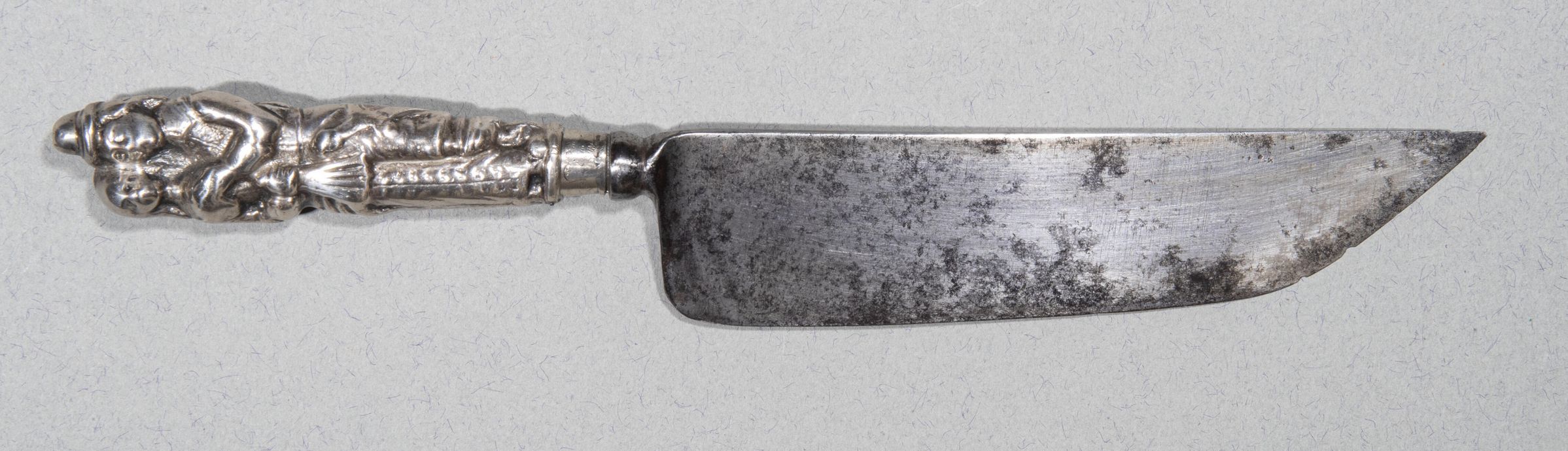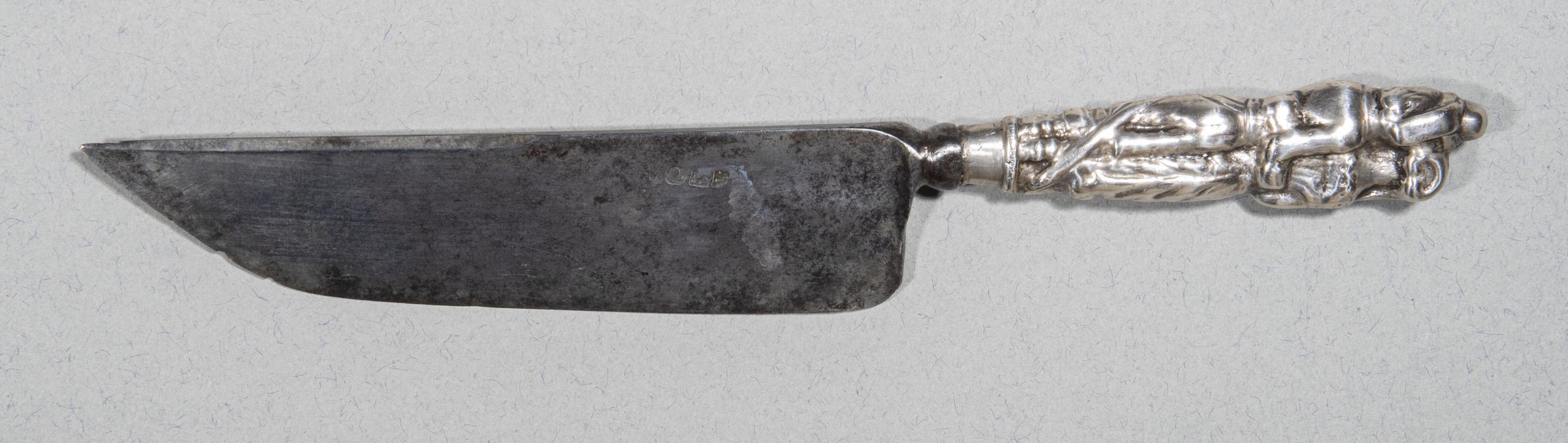 Blade of wide cleaver-like shape, with straight back, chamfered on one side toward the point, and very slightly convex edge sloping slightly toward the deep chisel-shaped point; short hemispherical bolster. Handle of silver, cast in form of two lovers embracing dressed in the style of about 1640, and standing on a low oval-section plinth. She holds a fan in her right hand.