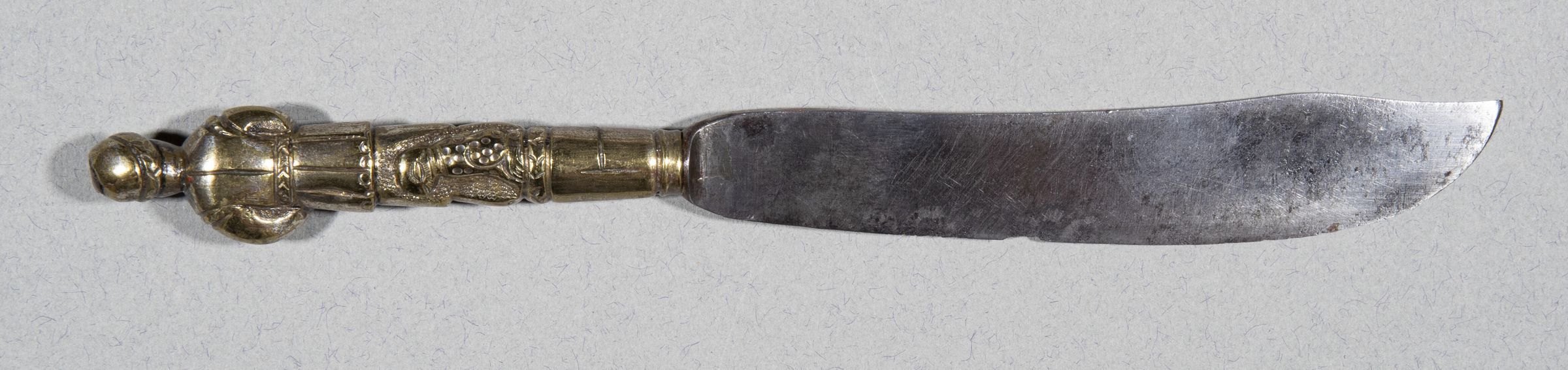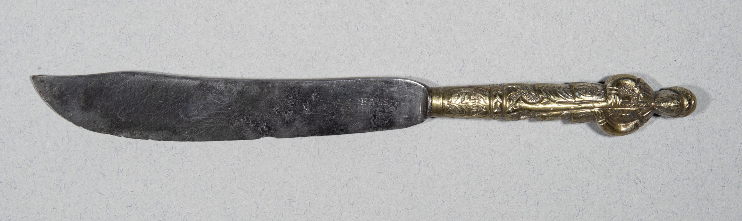Slightly scimitar-shaped blade similar to a fish knife. Handle of brass, cast in the form of a Huntsman in contemporary costume, holding his gun in front of him, with his dog seated beside him.Collection
