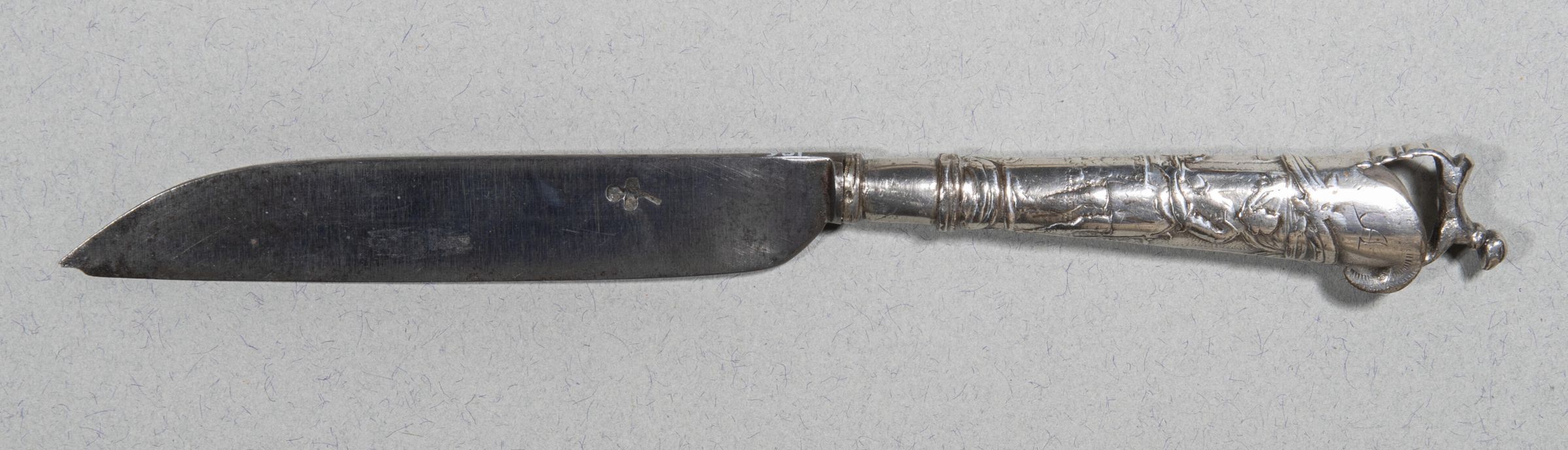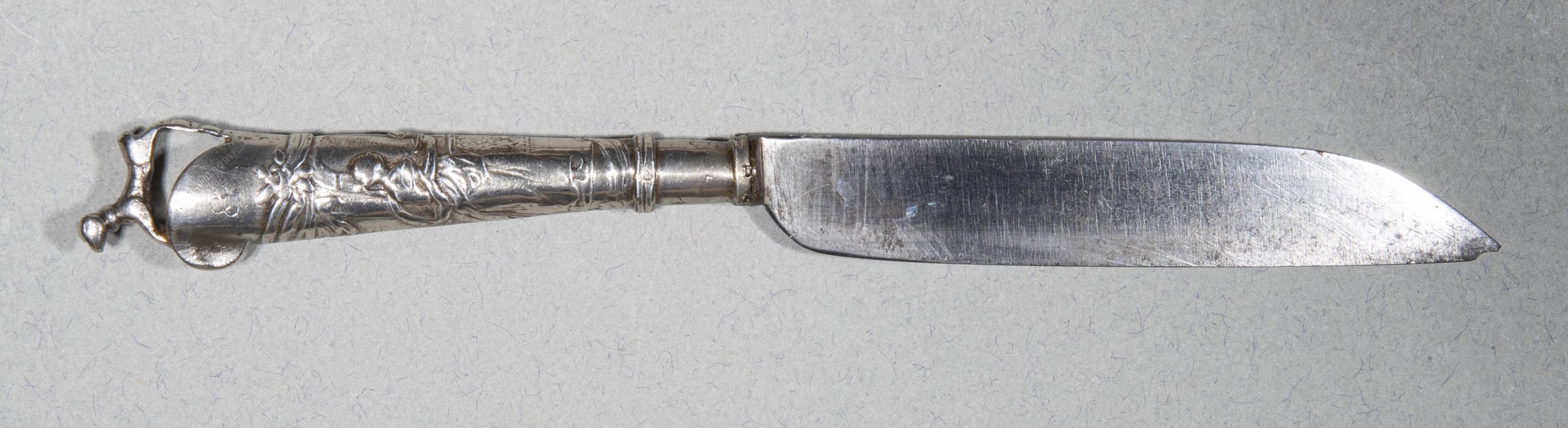 A knife with a handle of loaded silver with a design in repousse decoration of Salome offering the head of St John the Baptist to King Herod. The finial is cast in the form of a dog. The end engraved with the letters AVE (?).Collection