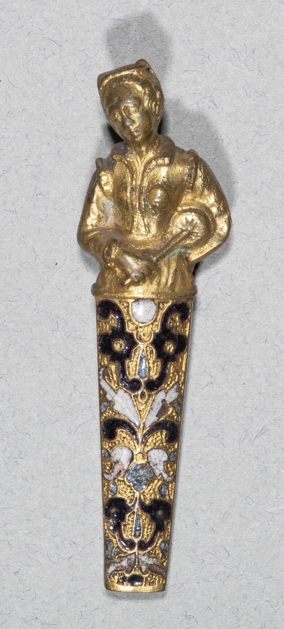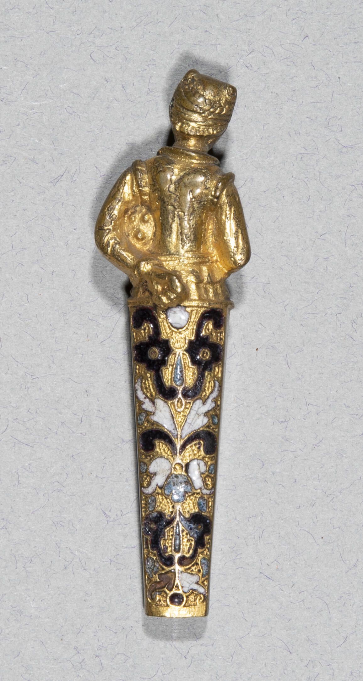 Of cast and gilded brass, the finial in the form of a woman in early 17th century costume, cut off at hip. She holds a small drum under her left arm, with her hand behind her back, and is beating it with a stick held in her other hand. The handle decorated in white, black and blue champleve enamel with a design of opposing S-scrolls and stylised leaves against a slightly sunken matted ground, covered with punched dots.Collection