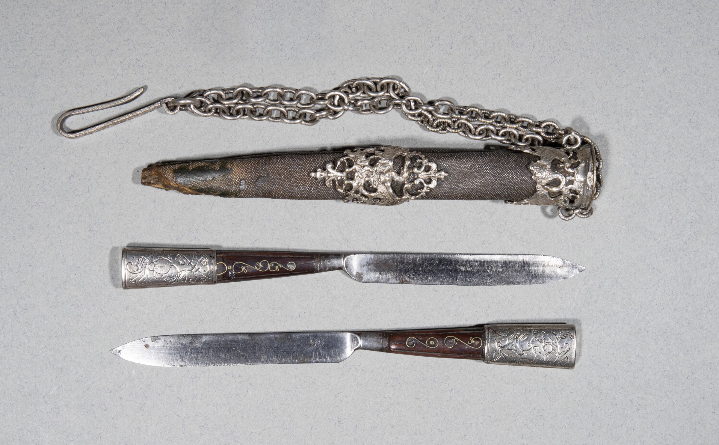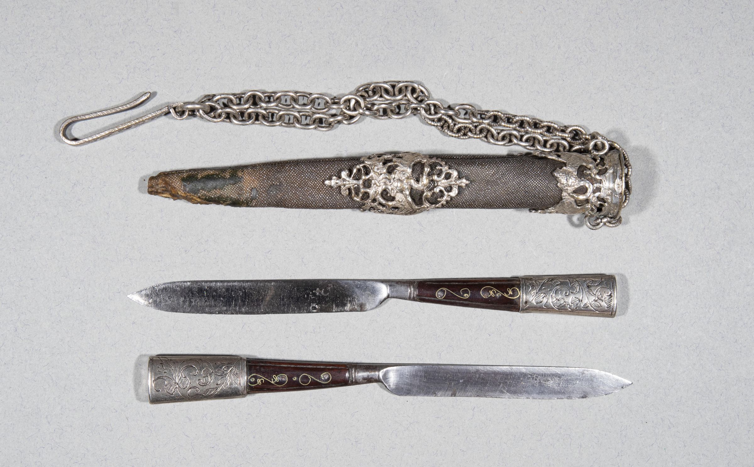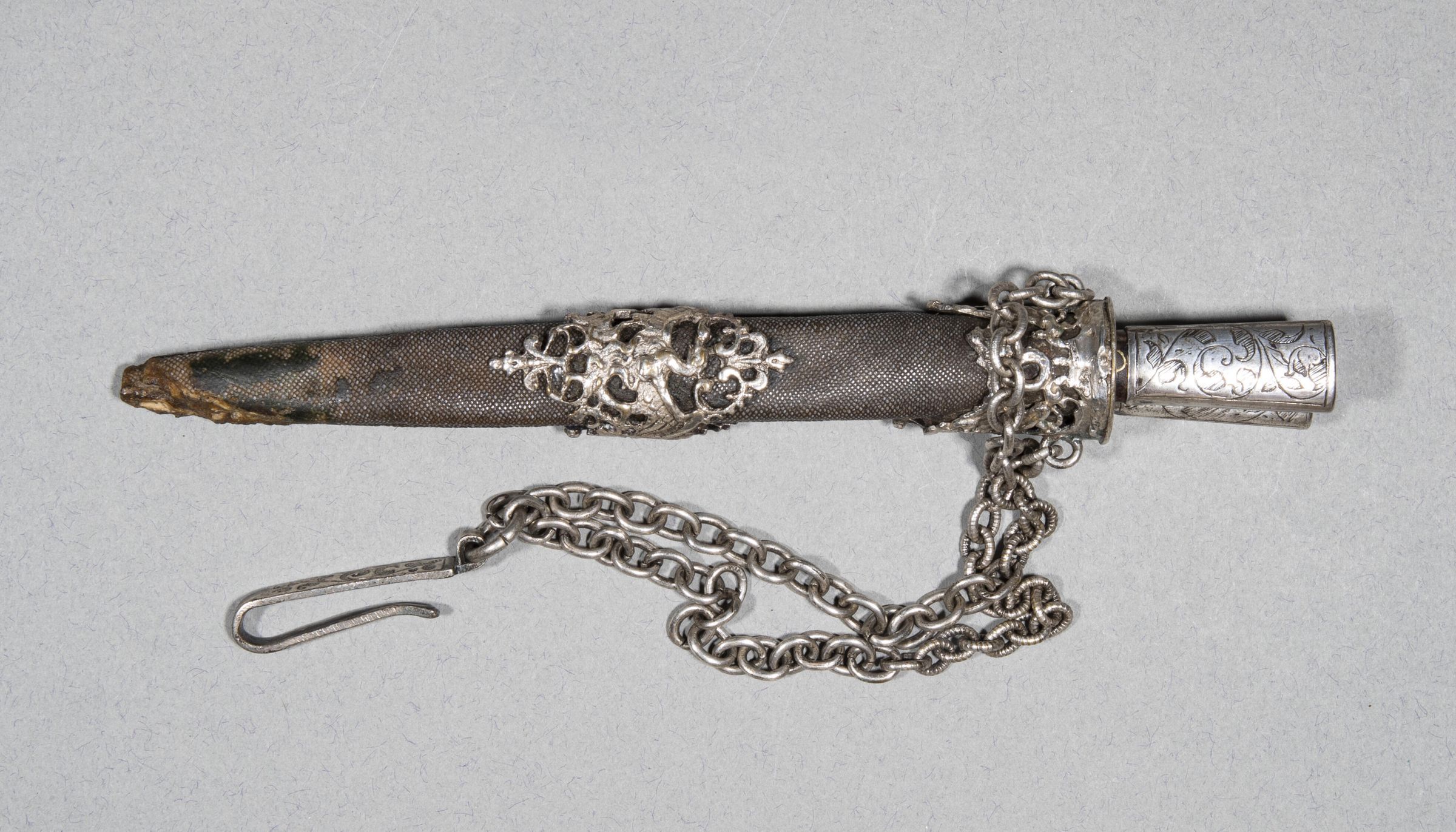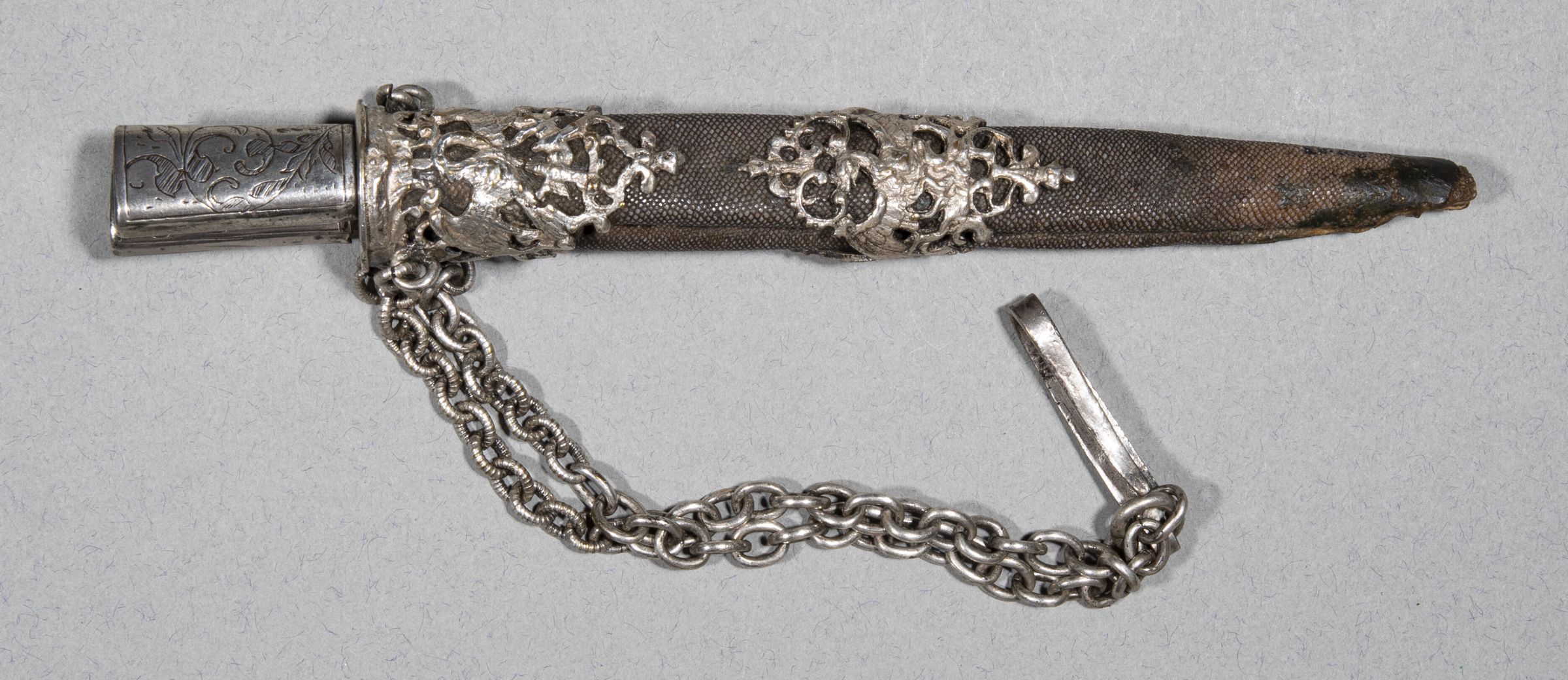 207.03 Case: Wood covered with shagreen, mouth and centre lockets of silver cast with openwork foliated scroll-work panels at front and rear: on the former a pelican in her piety and on the latter, a phoenix. Two rings, one on either side of the mouth of the case are attached to 2 silver suspension chains. These are in turn attached at the top to a slender, flat belt-hook, engraved on the front with a spray of hatched foliage.Collection